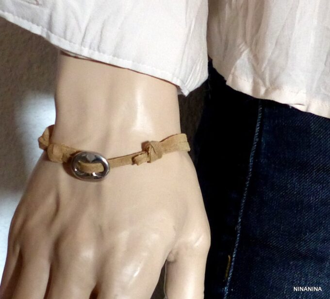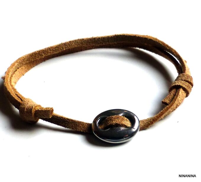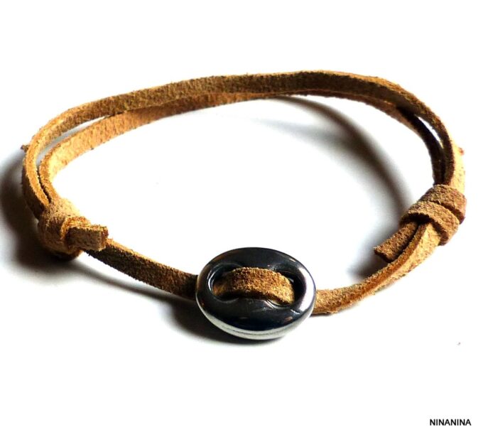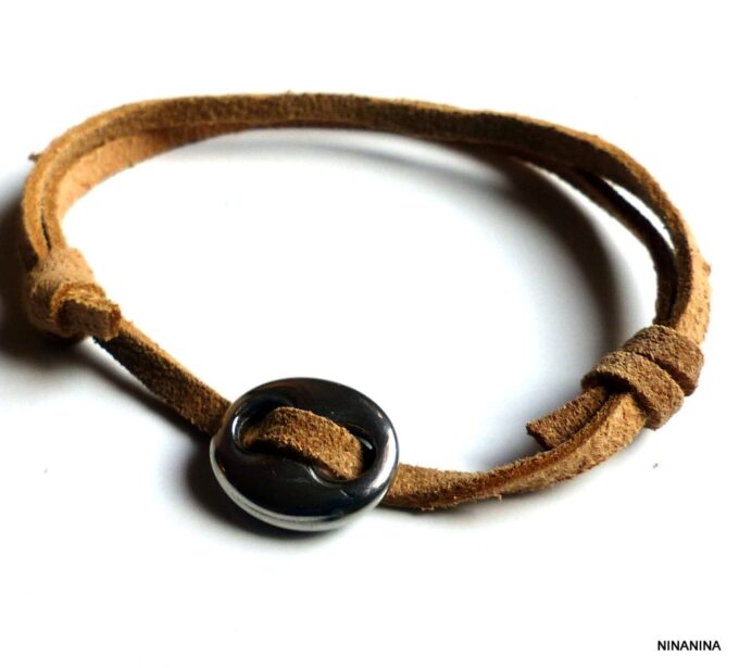 Bracelet cordon homme grain de café acier inoxydable composé d’un grain de café en acier inoxydable monté sur un lacet de daim naturel.