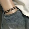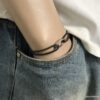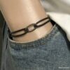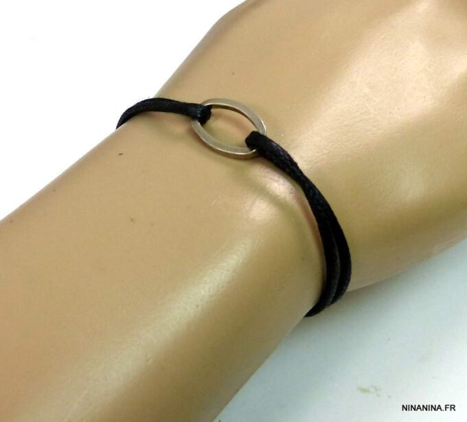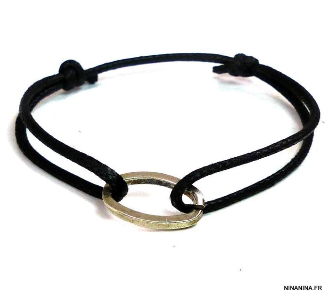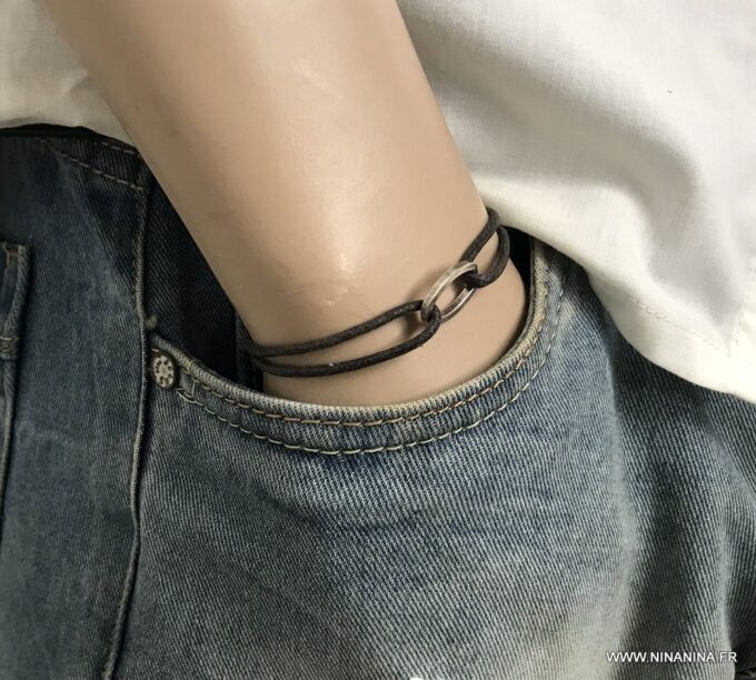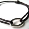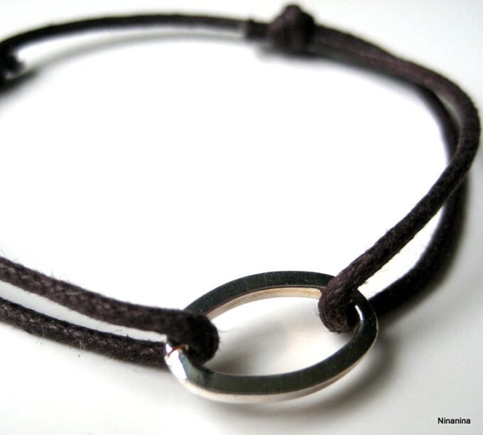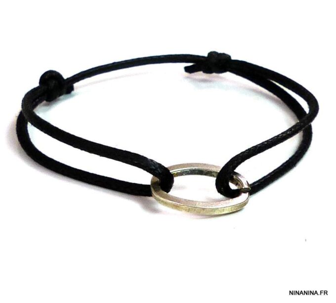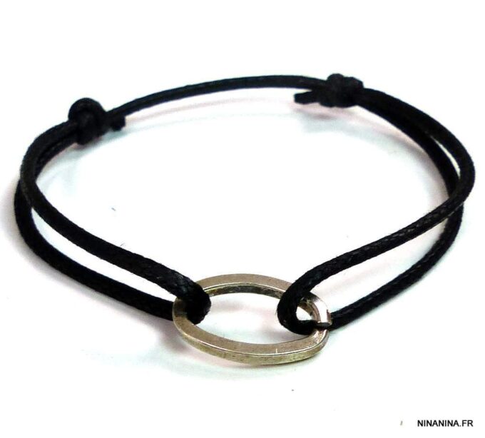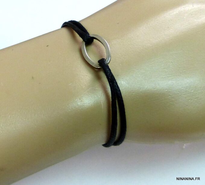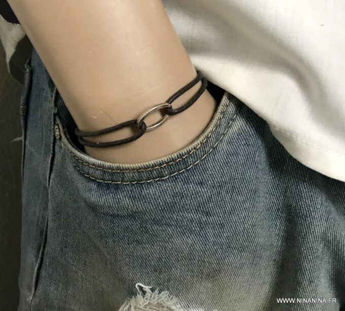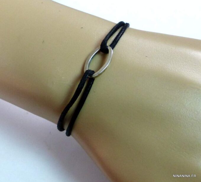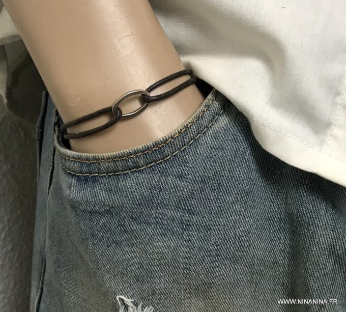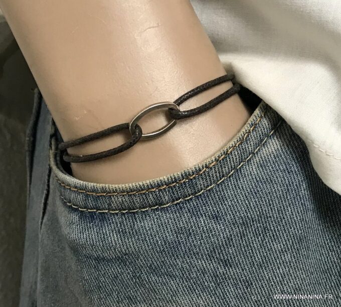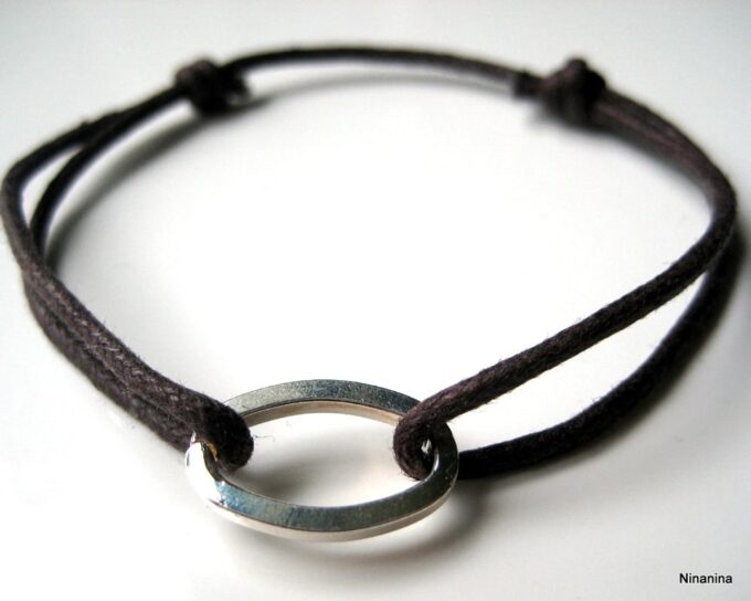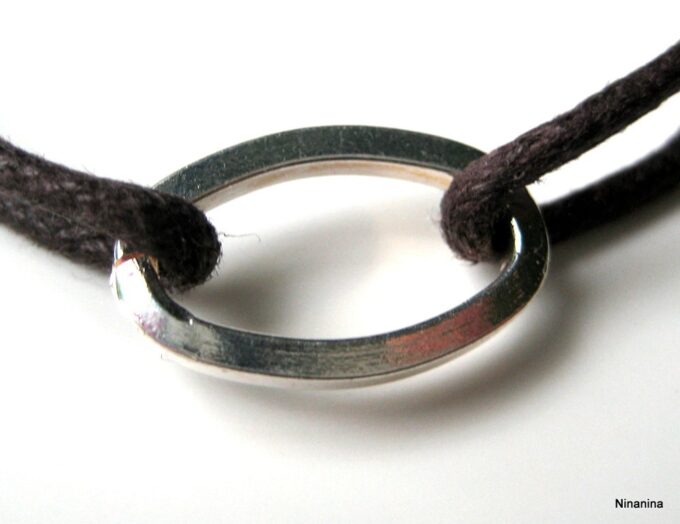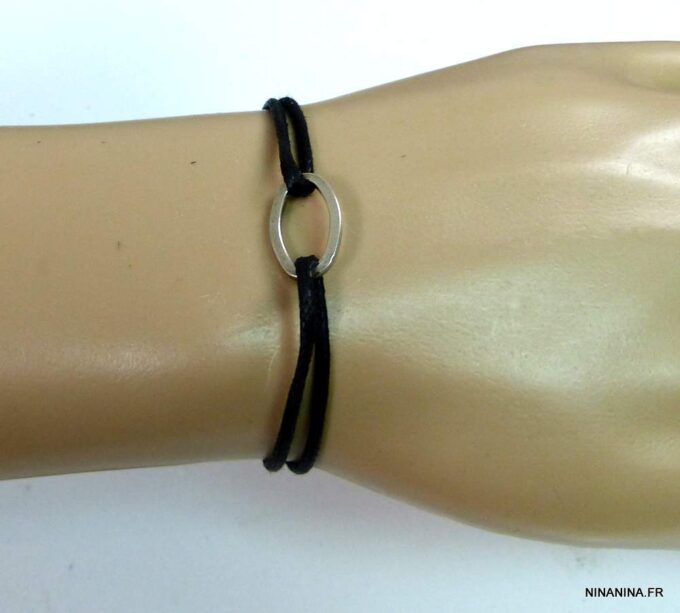 Bracelet cordon homme pas cher acier inoxydable argenté constitué d’un anneau ovale en acier inoxydable monté sur cordon de coton ciré.