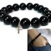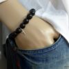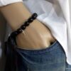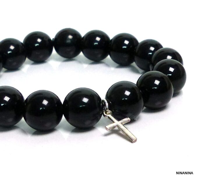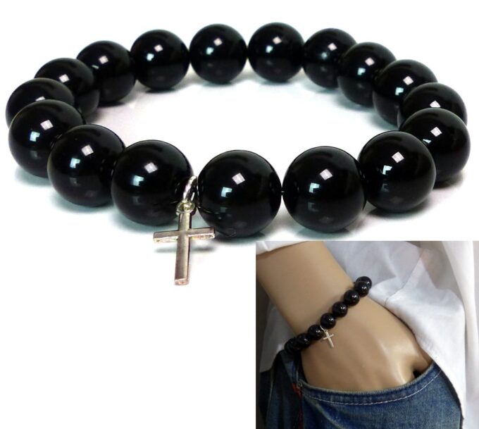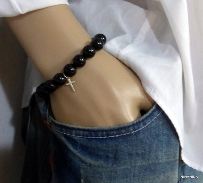 Bracelet croix Argent homme perles noires agate naturelle composé de perles agate noires et d’une petite croix en argent 925 montés sur un elastique resistant.