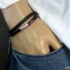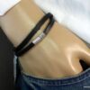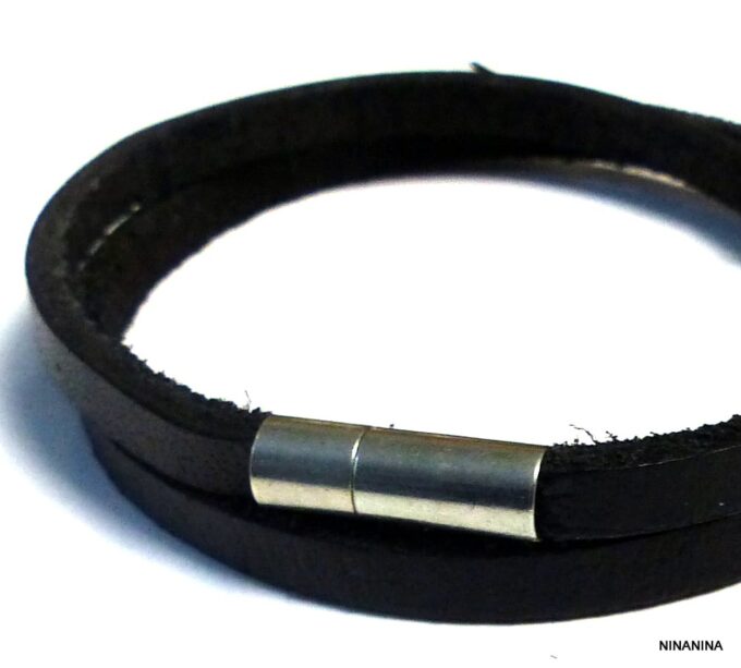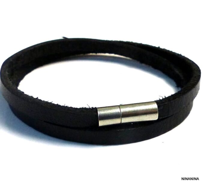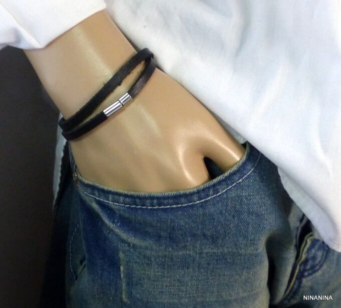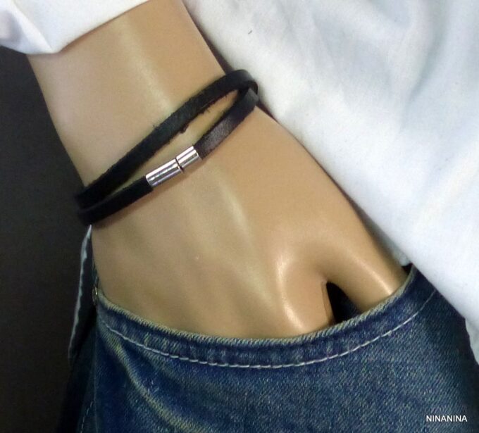 Bracelet homme lacet cuir 2 tours Acier inoxydable composé d’un lacet de cuir (5 mm de large) terminé par un fermoir cylindrique en acier inoxydable.