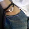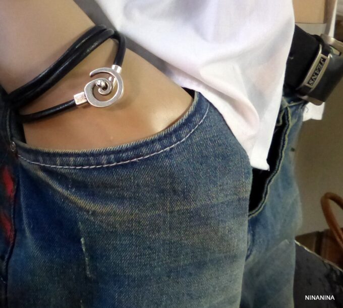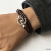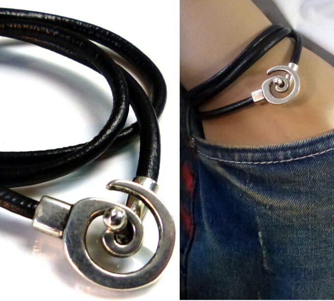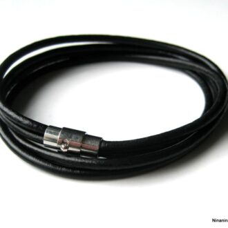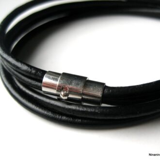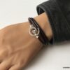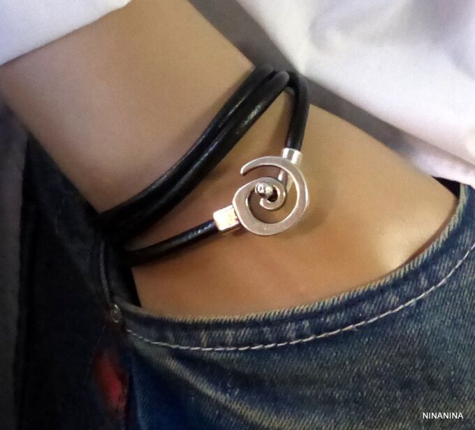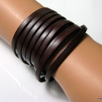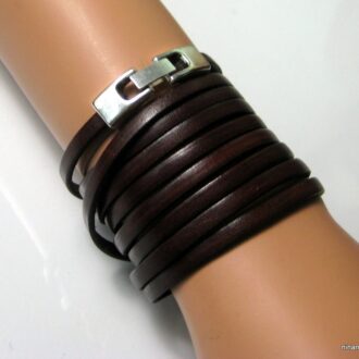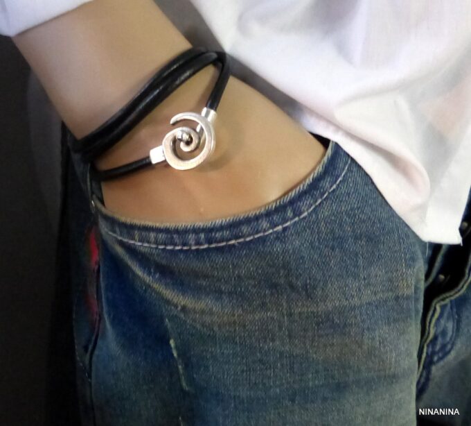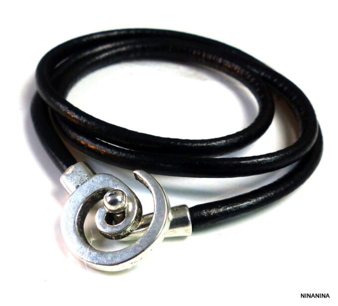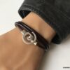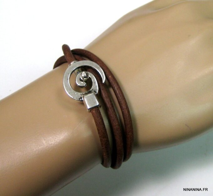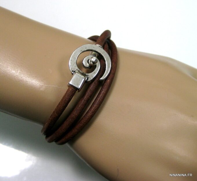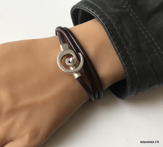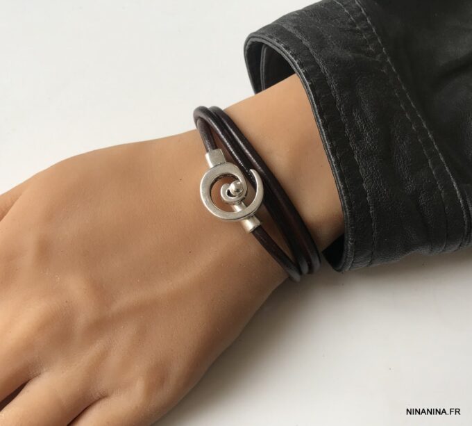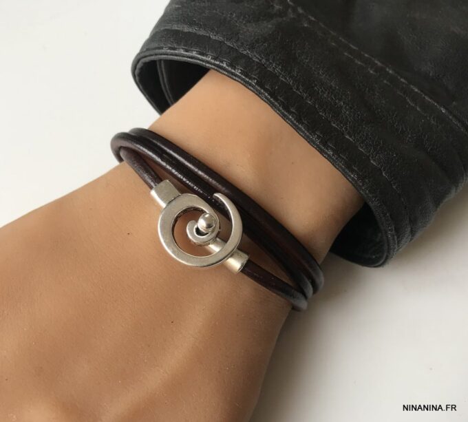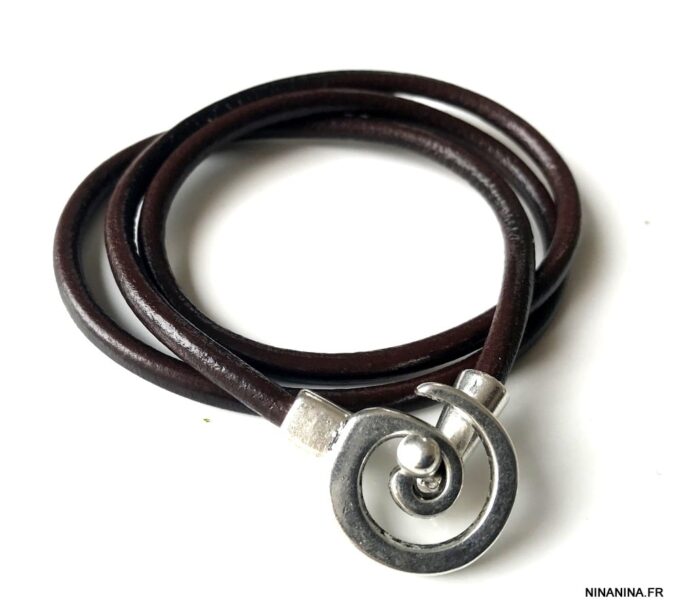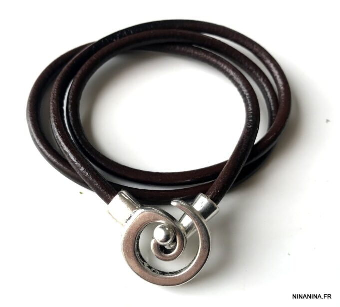 Bracelet homme cuir 3 tours fermoir spirale argenté composé d’un cordon de cuir marron chocolat monté sur un fermoir spirale en métal argenté à enrouler autour du poignet.
