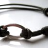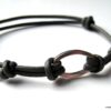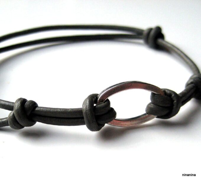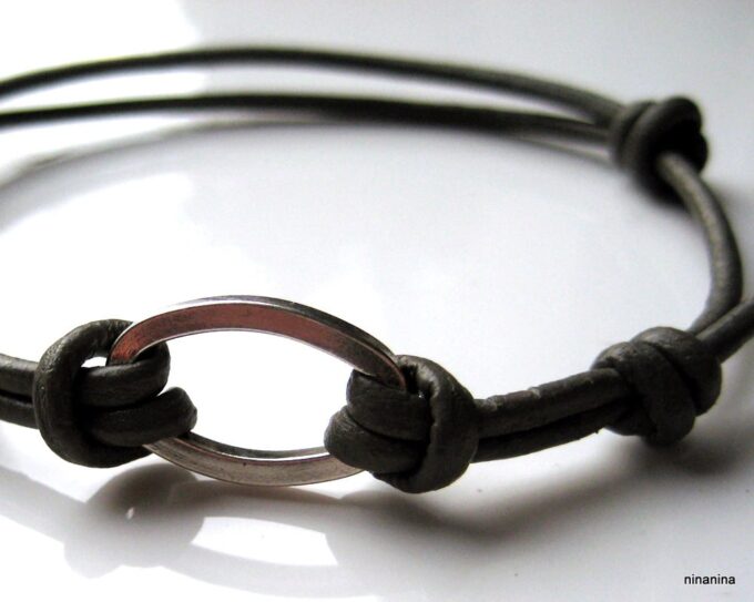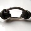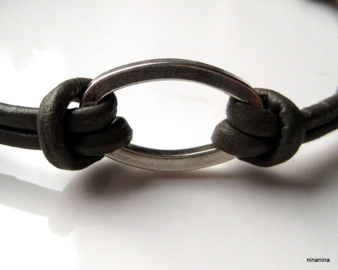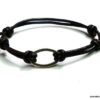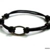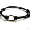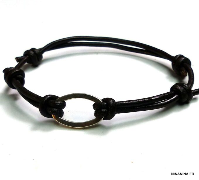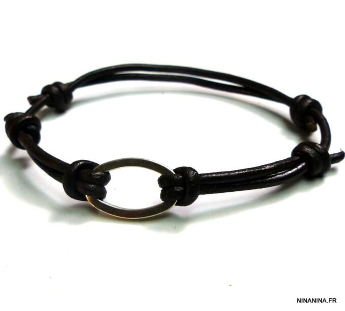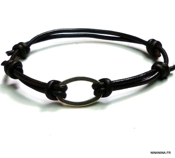 Bracelet cordon cuir anneau ovale métal argenté composé d’un anneau ovale en métal argenté monté sur un cordon de cuir noir (2 mm de diamètre).