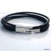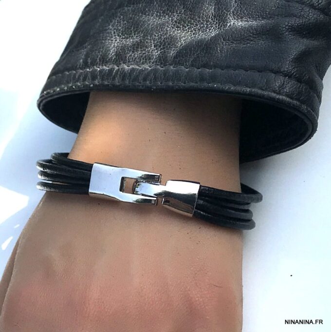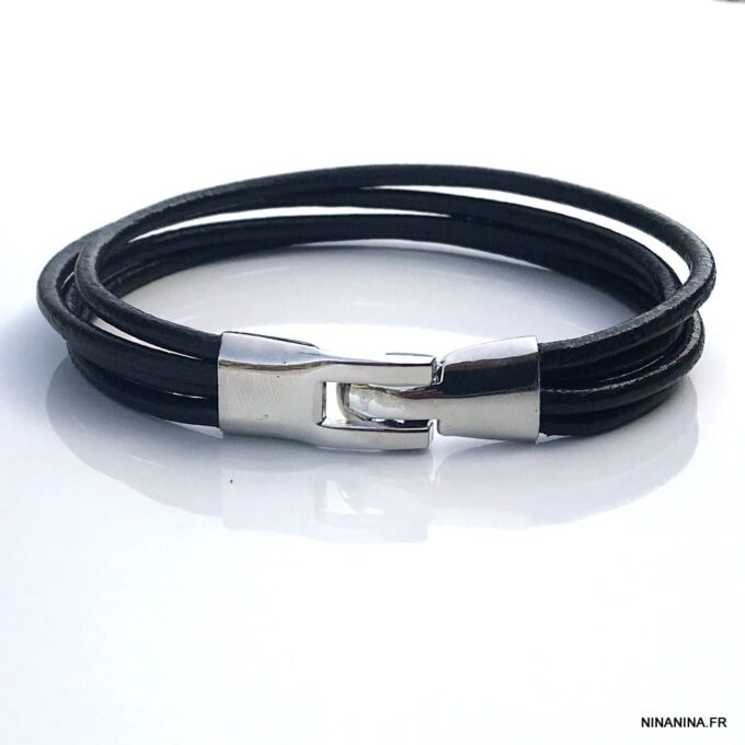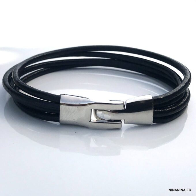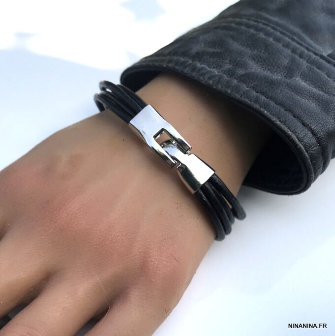 Bracelet cuir noir homme multirang fermoir argenté