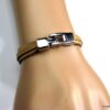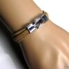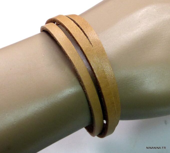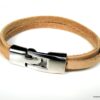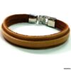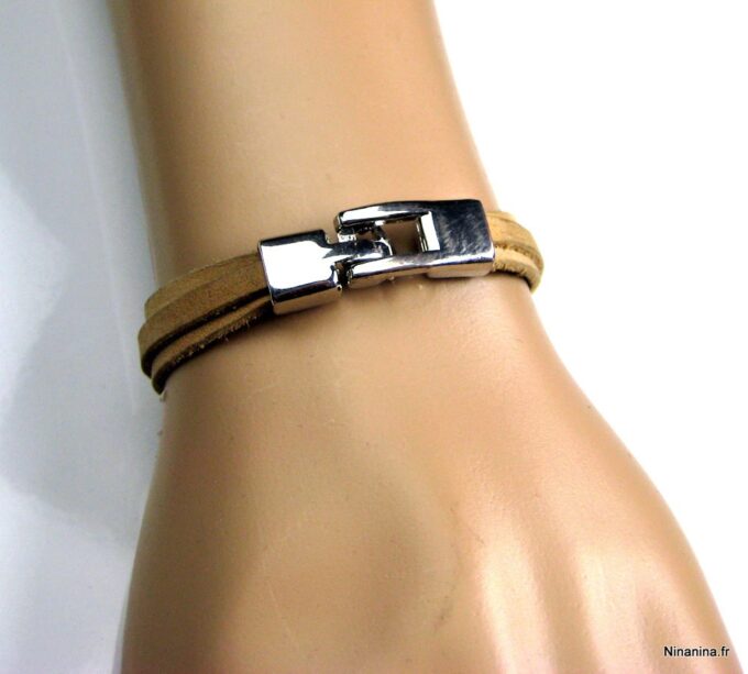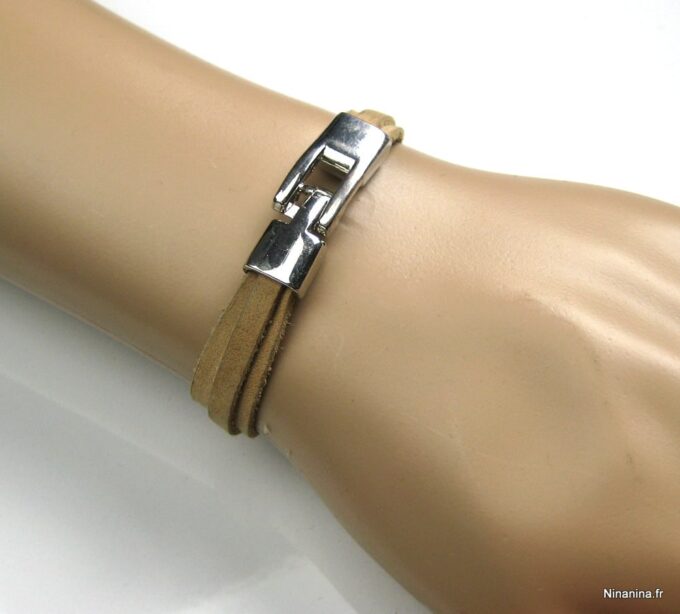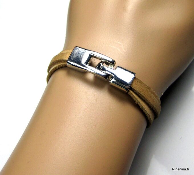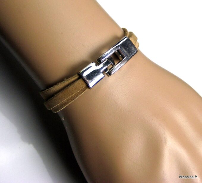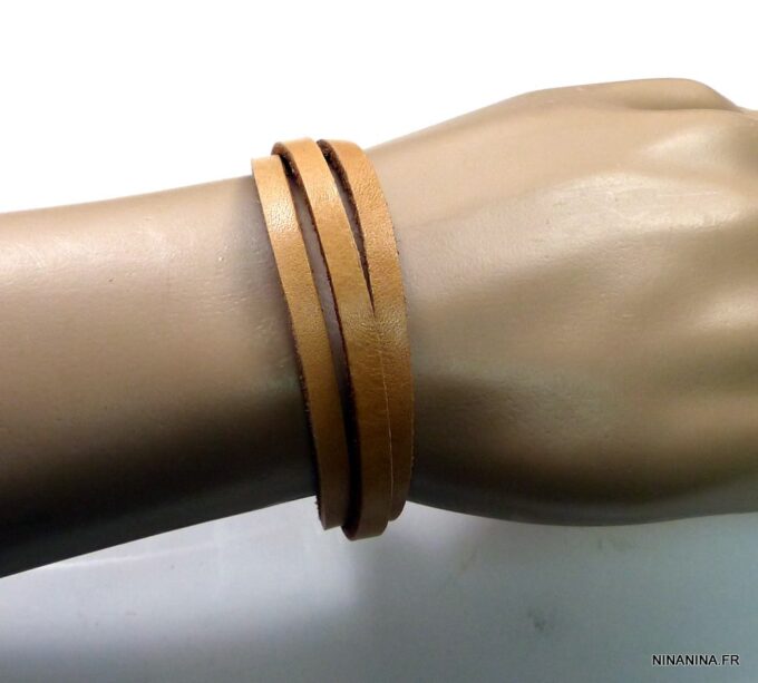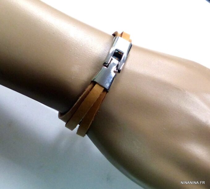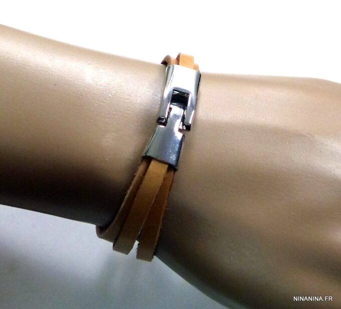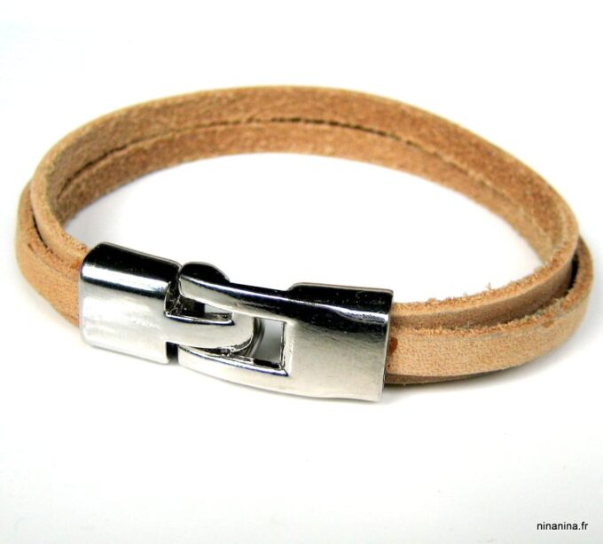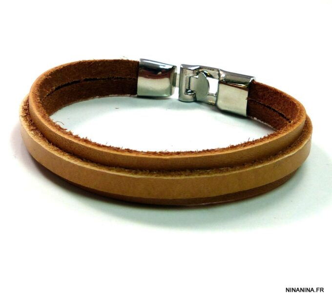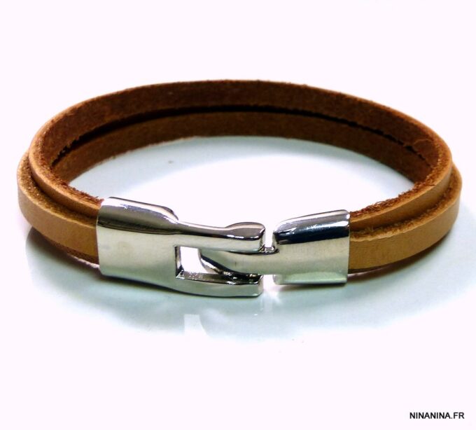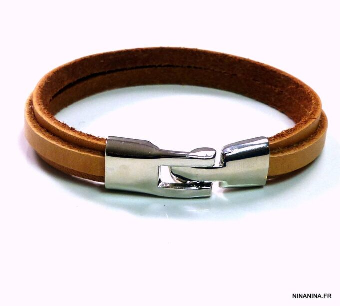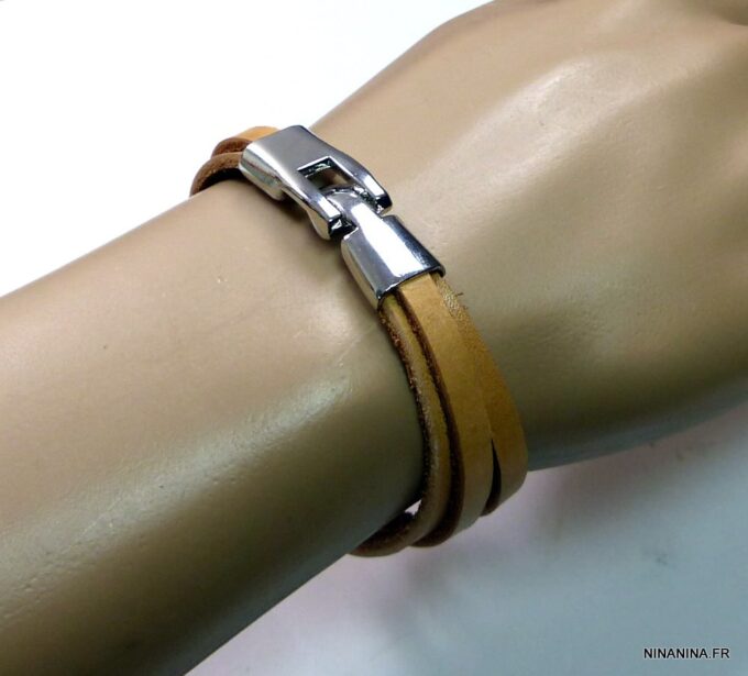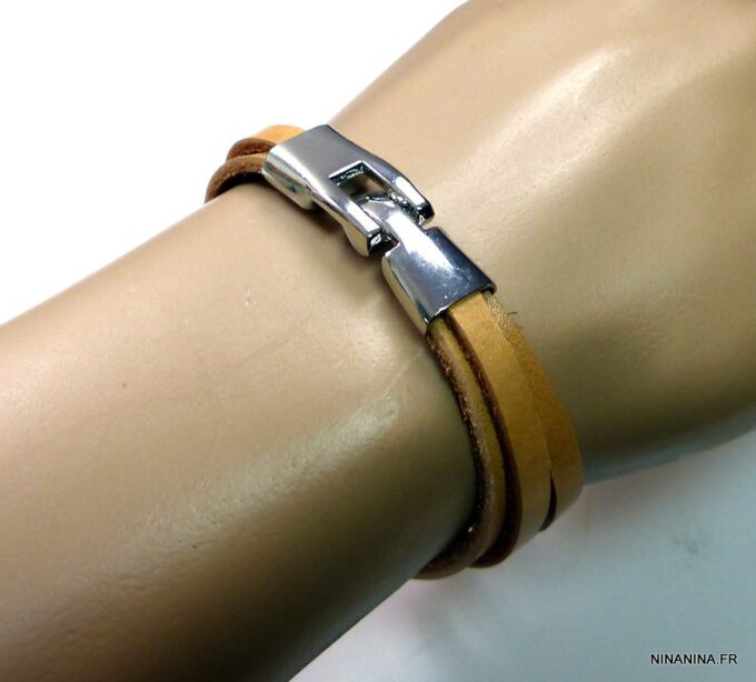 Bracelet homme cuir naturel fermoir métal argenté composé de 3 lanières de cuir naturel (5 mm de large) montés sur un fermoir rectangulaire en métal argenté. Largeur : 1 cm. Existe aussi en noir, marron chocolat et turquoise. Longueur : 20 cm. Livré dans sa pochette d’organza. Bijou 100% fait main.