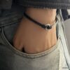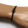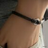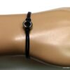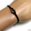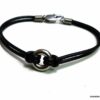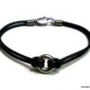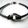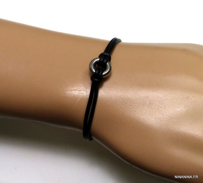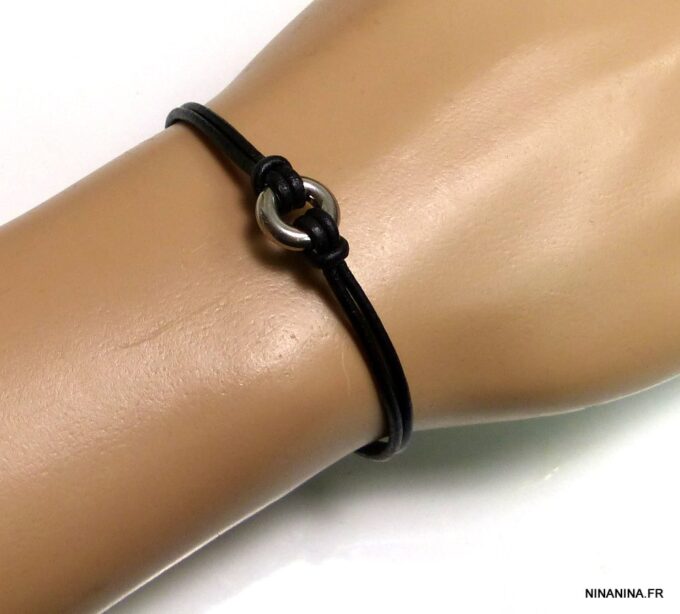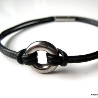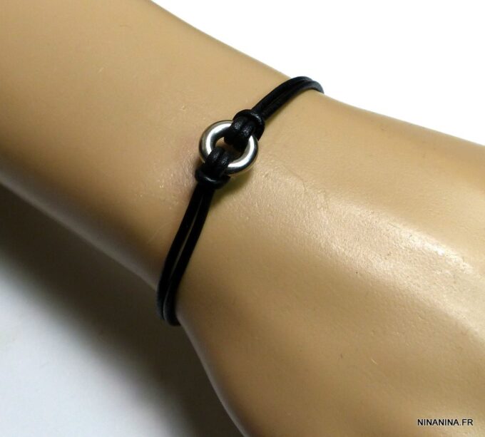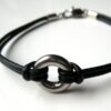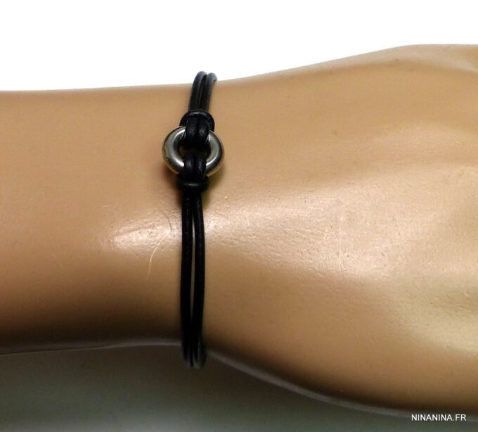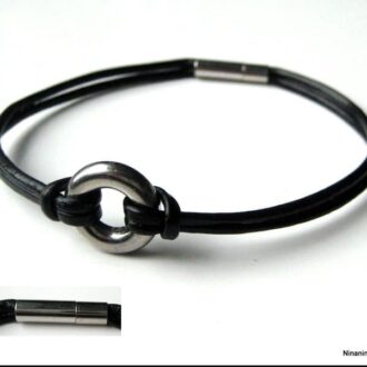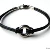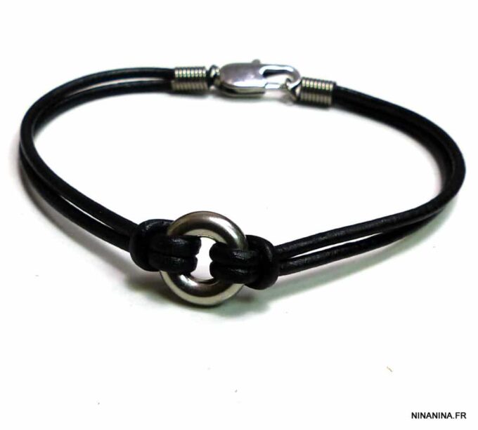 Bracelet anneau homme Acier chirurgical cordon cuir noir composé d’un disque bombé en acier inoxydable monté sur un double cordon de cuir noir (2 mm de diamètre).