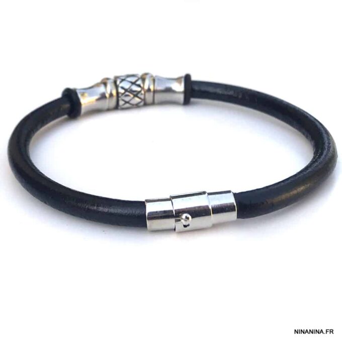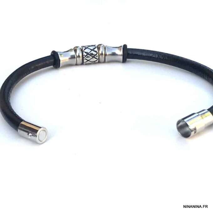 Optez sans hésiter pour ce magnifique Bracelet homme cuir et Acier Inoxydable fermoir aimanté composé de rondelles en acier inoxydable et d’un fermoir contemporain aimanté en Acier également monté sur un cordon de cuir noir (5 mm de diamètre) est fait pour vous!