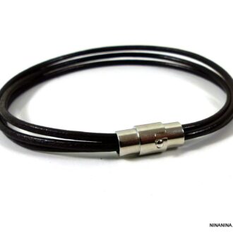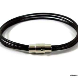 Bracelet 4 rangs cordon cuir noir fermoir Acier argent