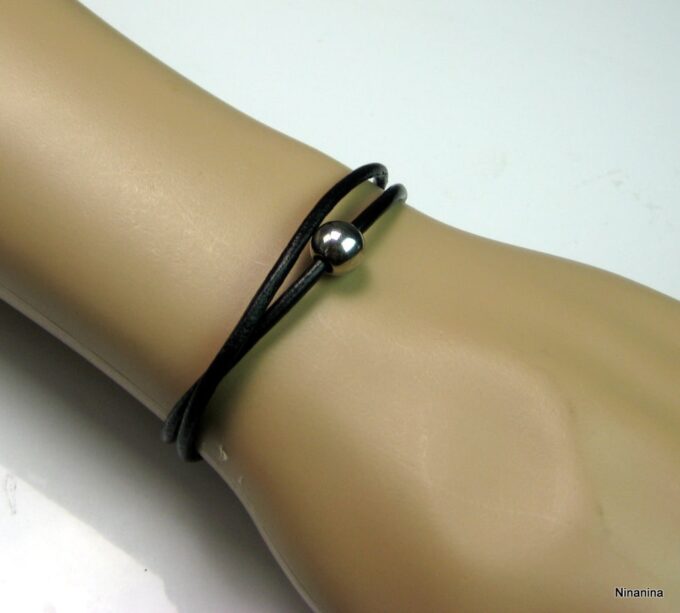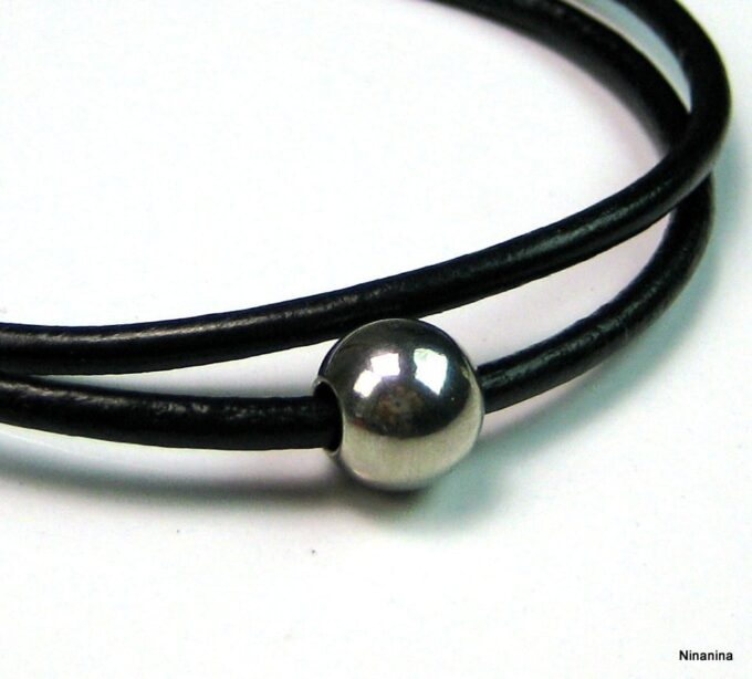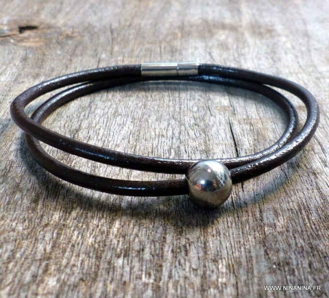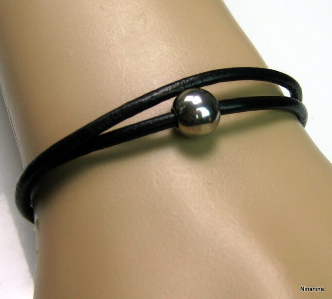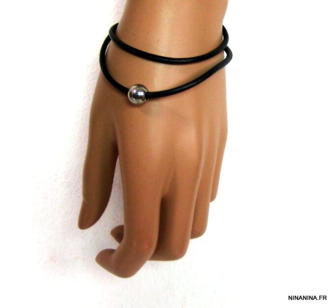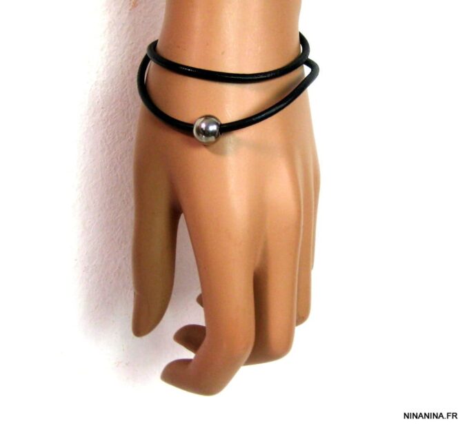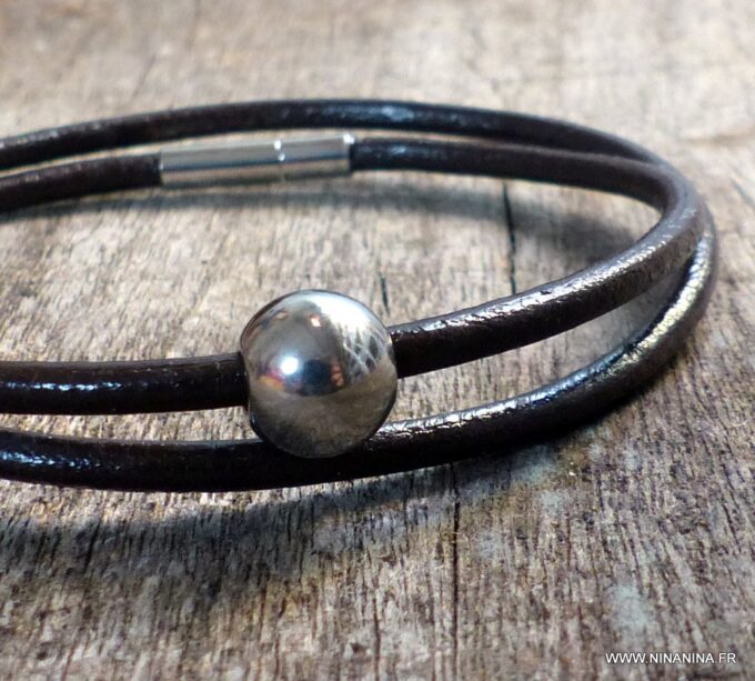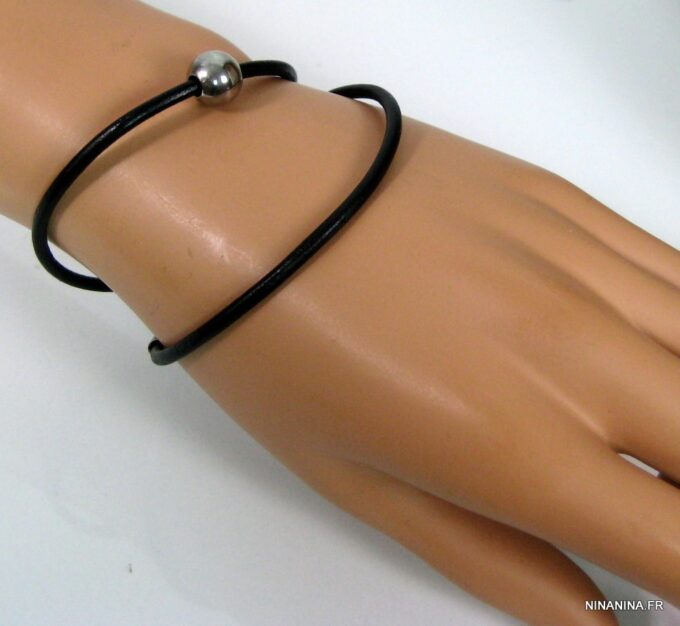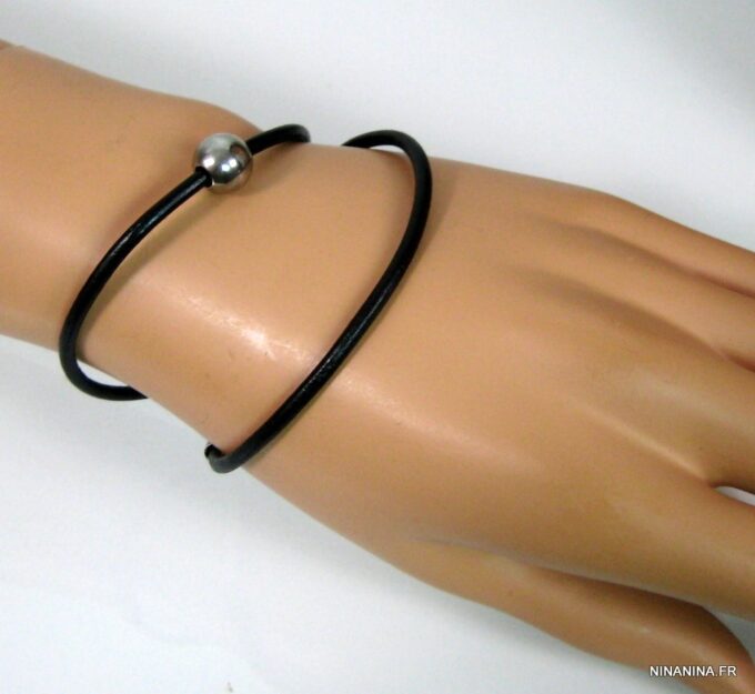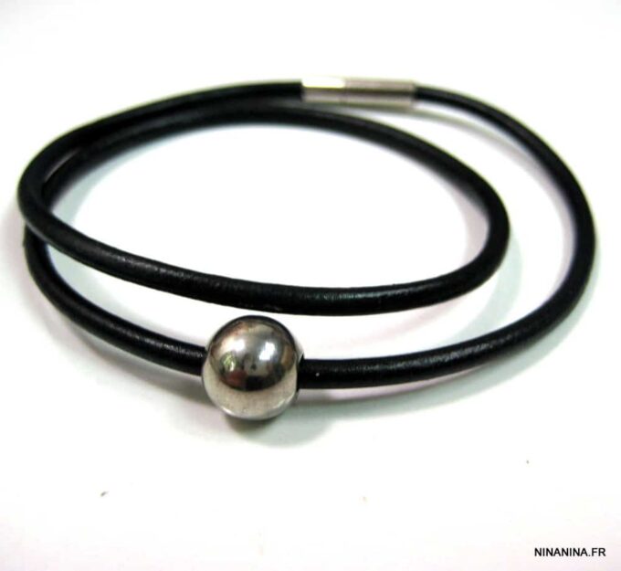 Bracelet cordon cuir 2 tours boule Acier inoxydable composé d’une perle en acier inoxydable montée sur un lien de cuir noir (3mm de diamètre) à enrouler autour du poignet.