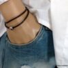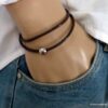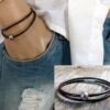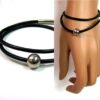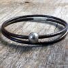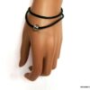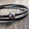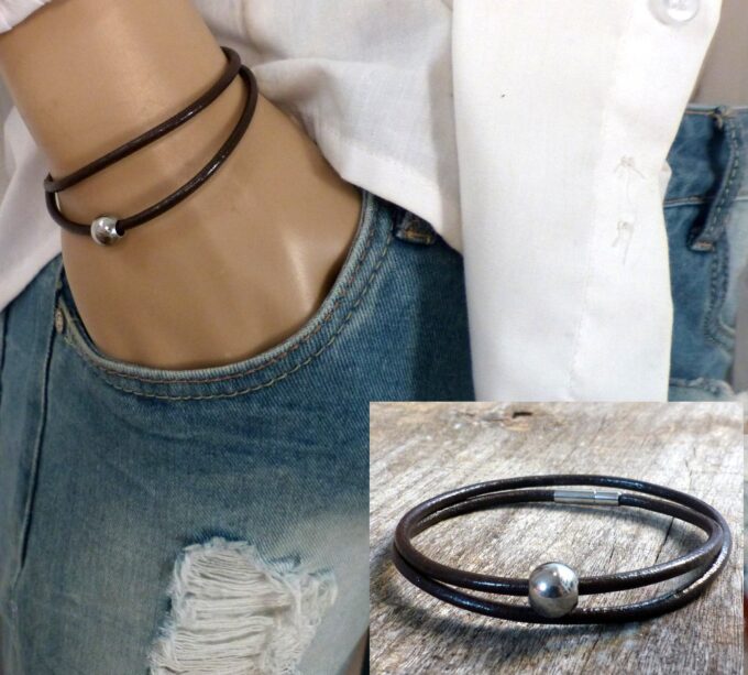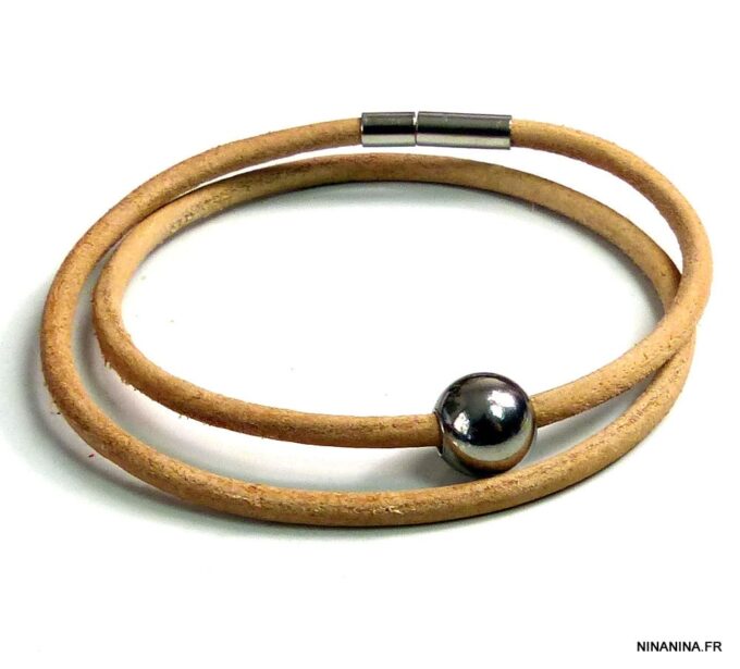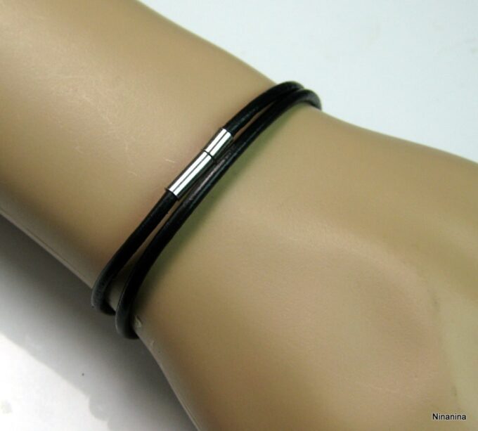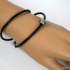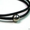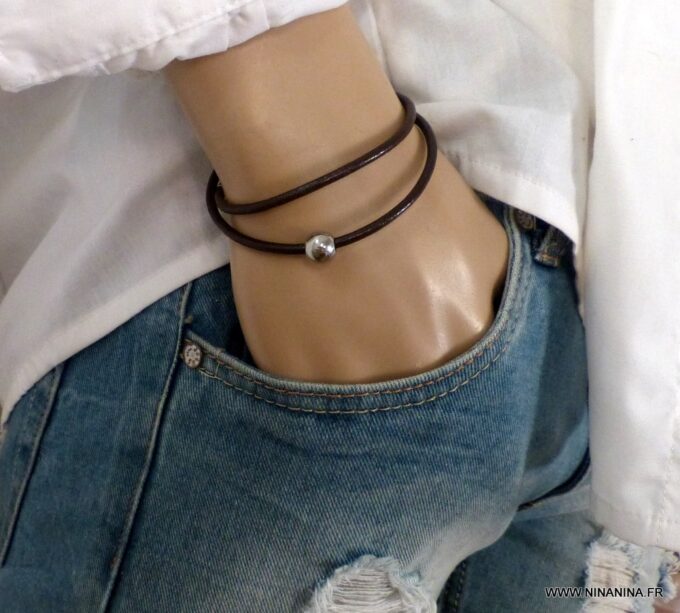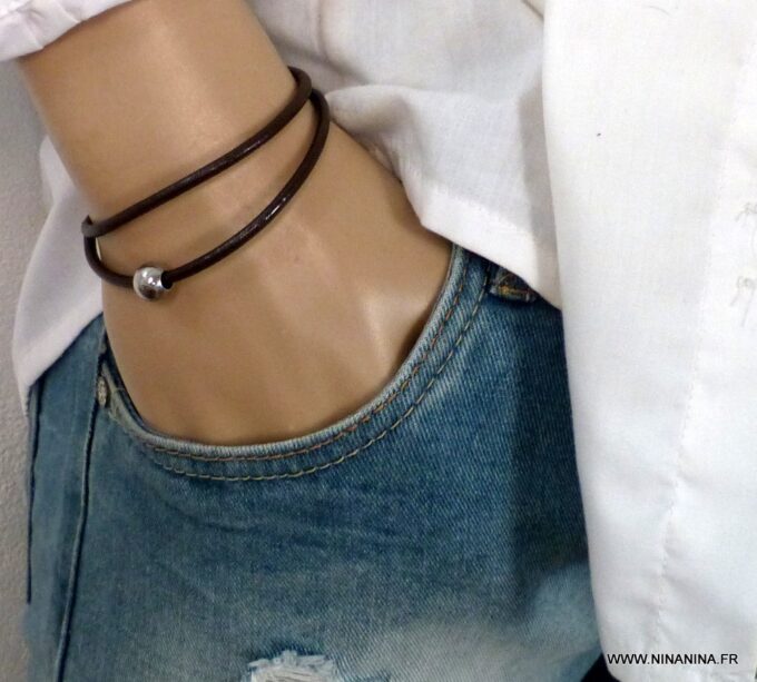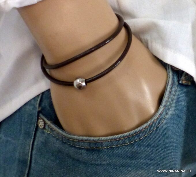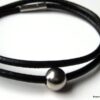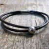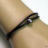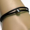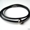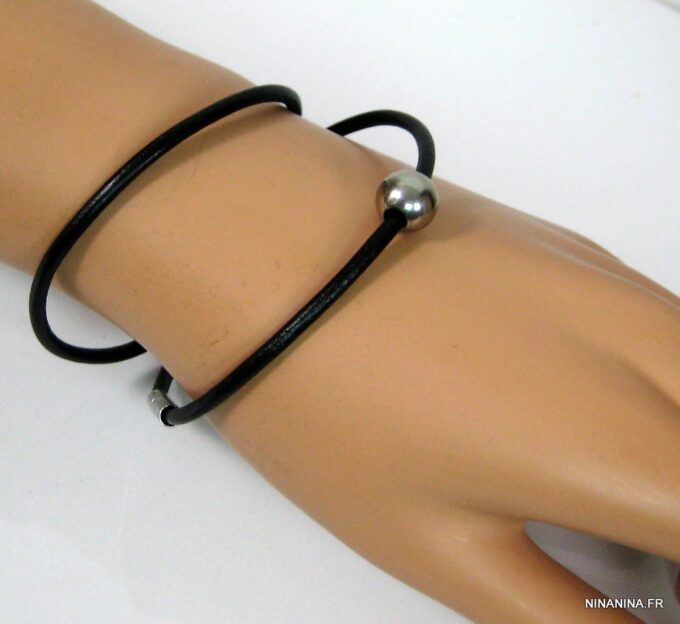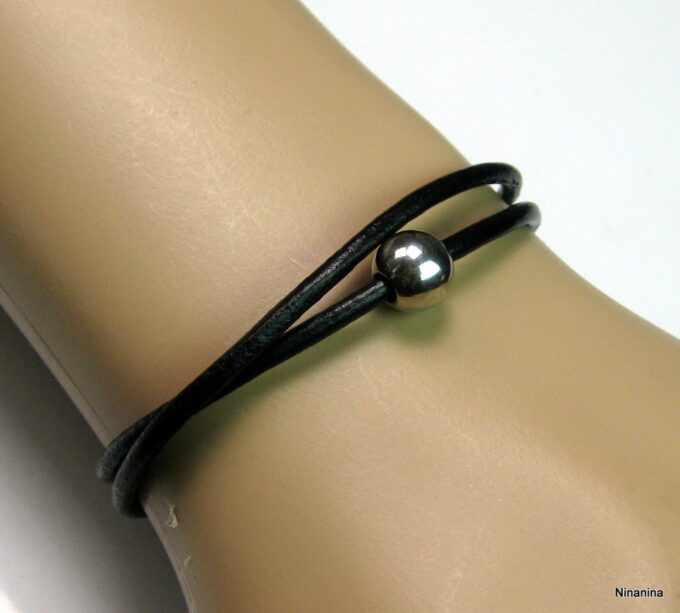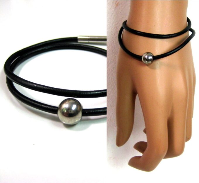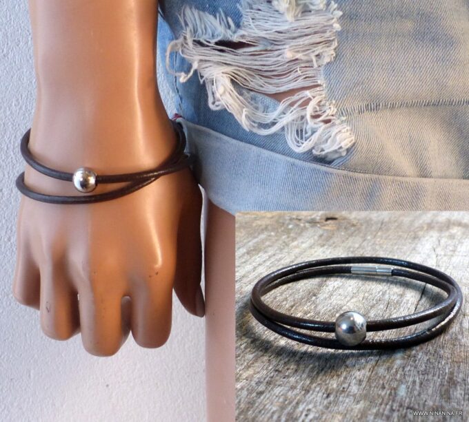 Bracelet cordon cuir 2 tours boule Acier inoxydable composé d’une perle en acier inoxydable montée sur un lien de cuir noir (3mm de diamètre) à enrouler autour du poignet.