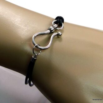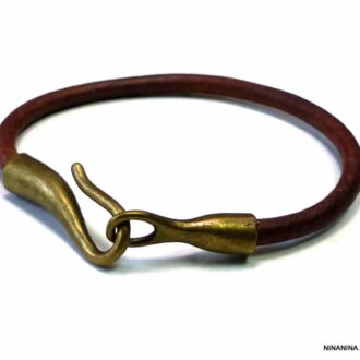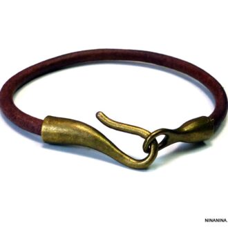 Bracelet homme cuir fermoir crochet métal bronze composé d’un cordon de cuir noir monté sur un fermoir crochet en métal bronze à enrouler autour du poignet.