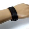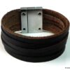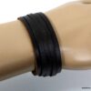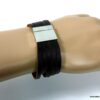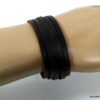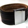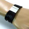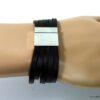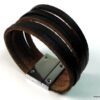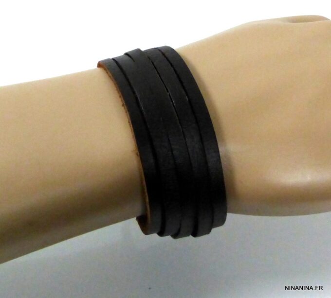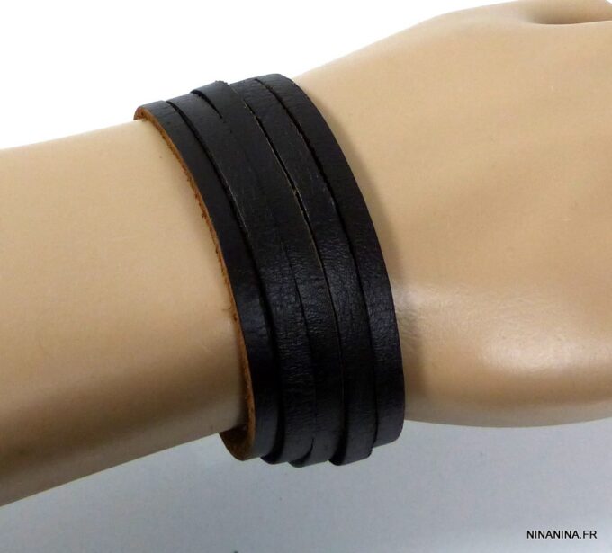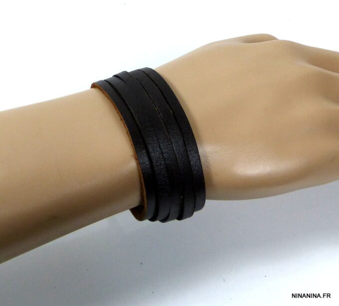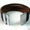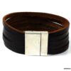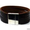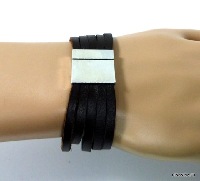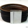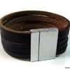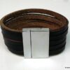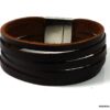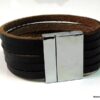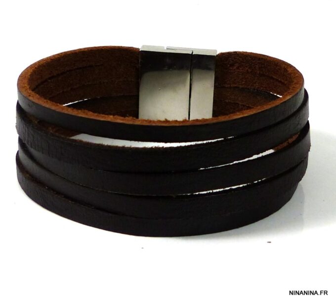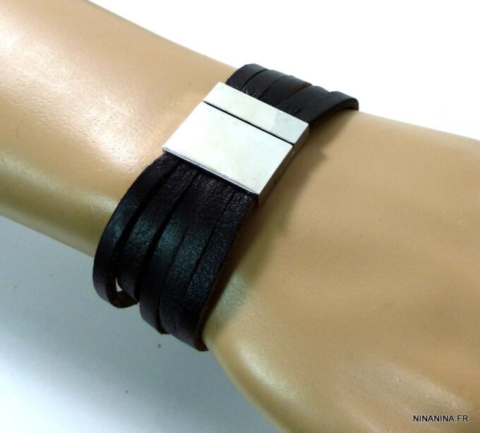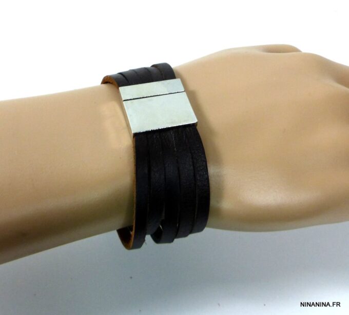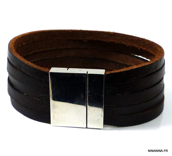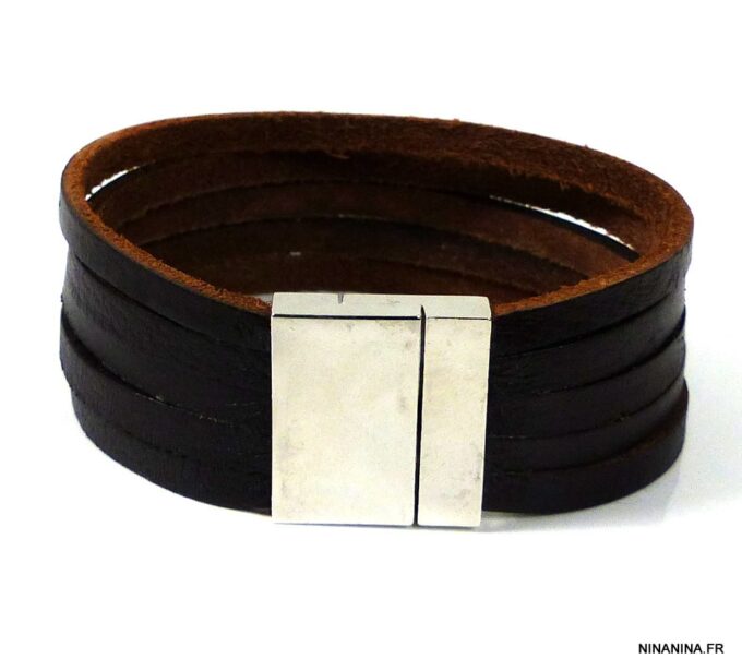 Bracelet manchette cuir multi rangs fermoir aimanté composé de 5 rangs de cuir marron chocolat (5 mm de large) montés sur un fermoir aimanté rectangulaire en métal argenté.