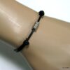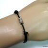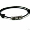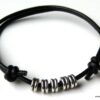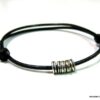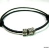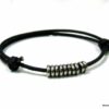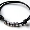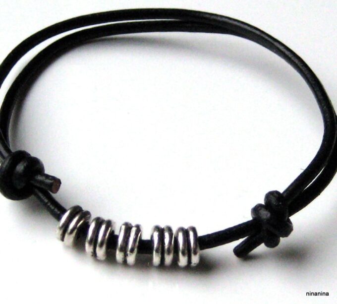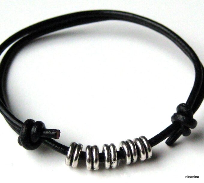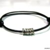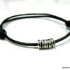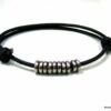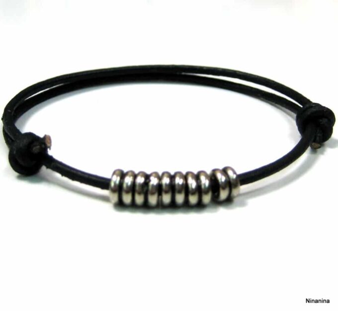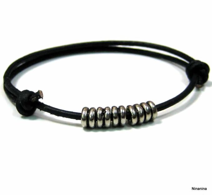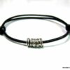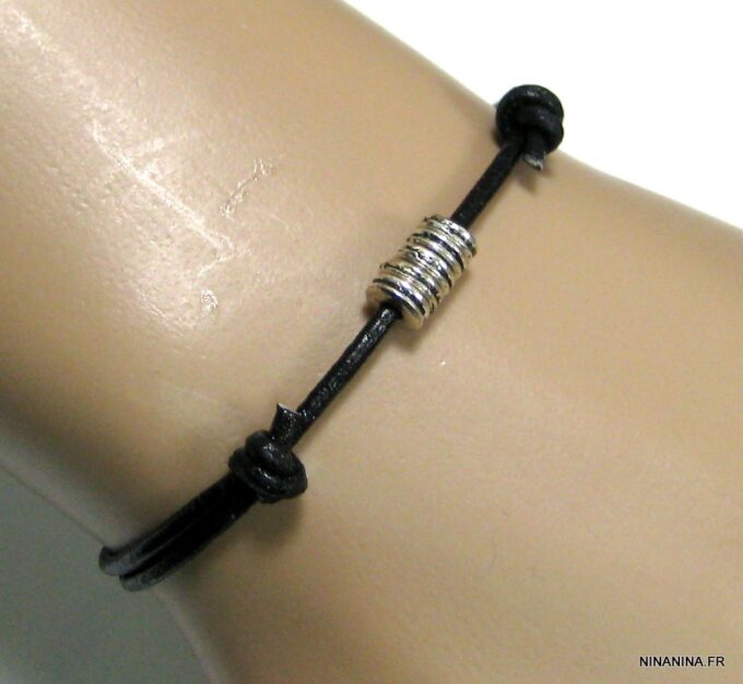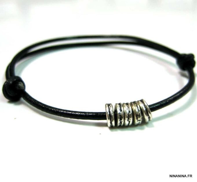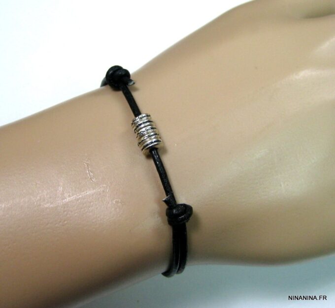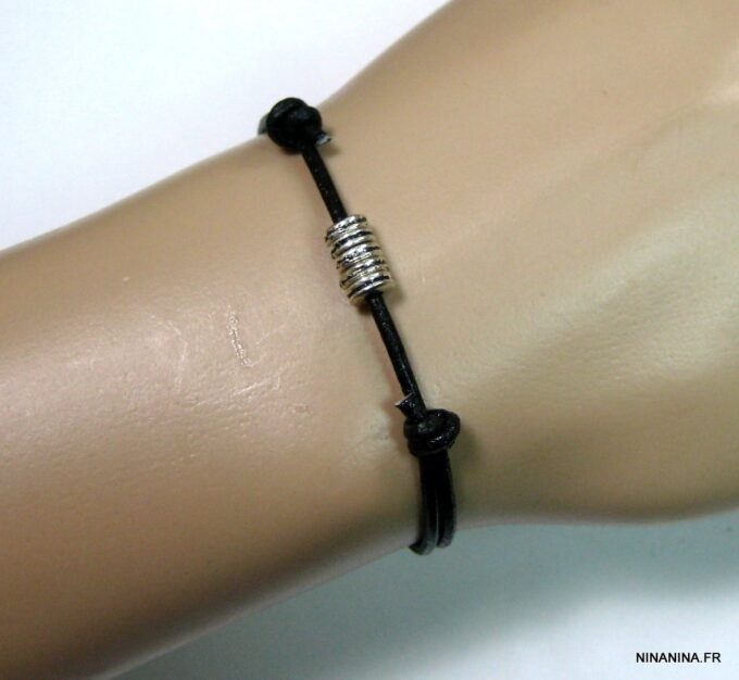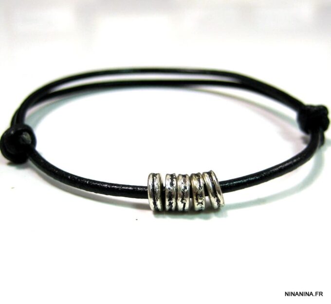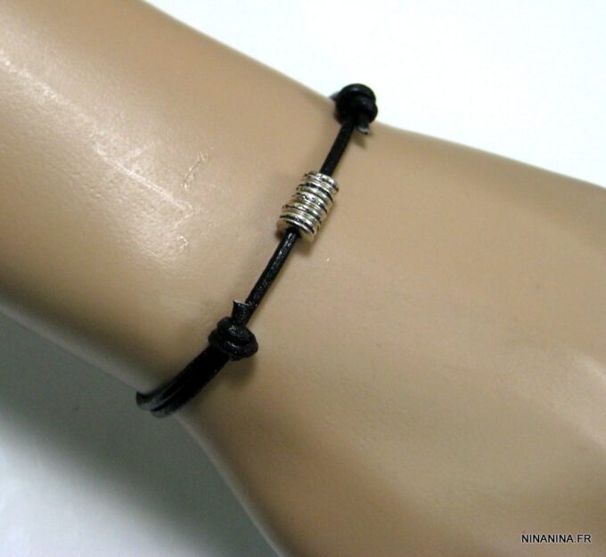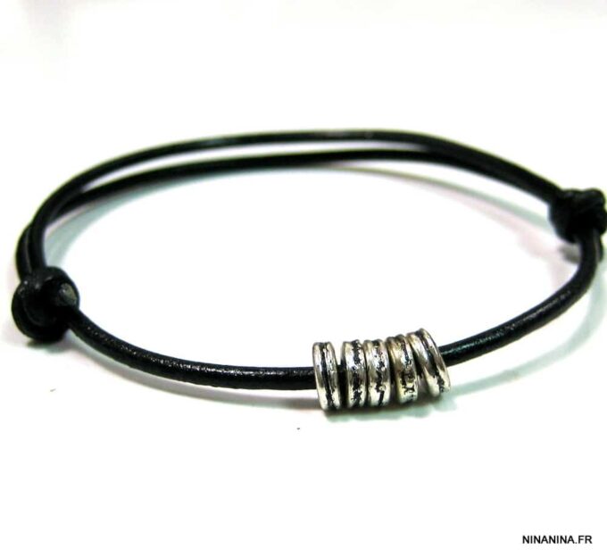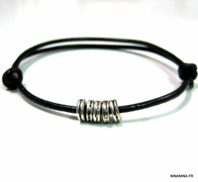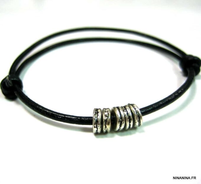 Bracelet cordon cuir fantaisie rondelles métal argent composé de 5 perles cylindriques en métal argenté montées sur un double cordon de cuir noir (2 mm de diamètre). Existe en noir, marron chocolat, gris et naturel. Dim des perles : 0,6 X 0,3 cm. Fermeture par liens coulissants. Diamètre : de 5 à 8 cm env réglable. Livré dans sa pochette d’organza. Bijou 100% fait main.