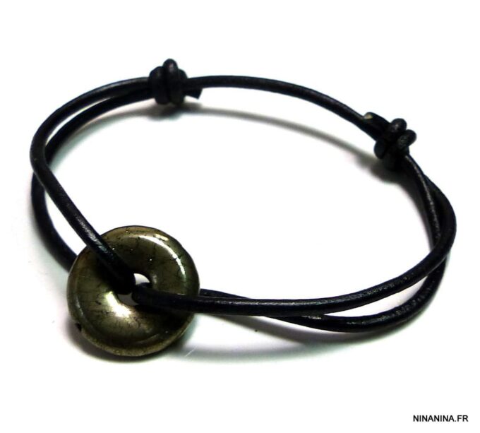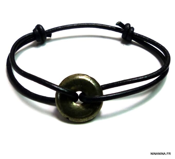 Bracelet pyrite de fer disque sur cordon cuir naturel
