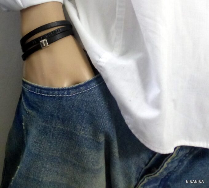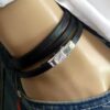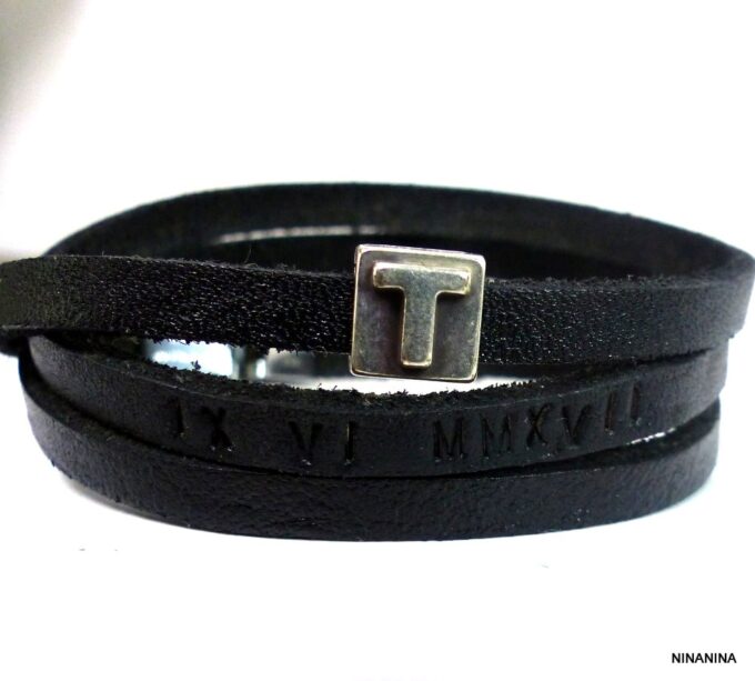 Habillez votre poignet avec une date en chiffres romains ou faites en cadeau emprunt d’émotion avec ce Bracelet cuir chiffre romain date personnalisée, composé d’une perle lettre carrée en métal argenté coulissant sur un lacet de cuir noir (5 mm de large) terminé par un fermoir cylindrique en acier inoxydable, à enrouler autour du poignet. A personnaliser avec une date en chiffres romains (à indiquer en commentaire).. Gravé à la main, ce Bracelet en cuir brut et son fermoir original, gravé avec une date en chiffre romain (12 caractères maximum) fera un cadeau parfait pour la fête des pères ou la fête des mères. La gravure apporte une touche personnelle et fait de ce bracelet home cuir un cadeau personnalisé unique au monde ! Dim de la lettre : 0,9 X 0,9 cm. Merci d’indiquer en commentaire la lettre choisie.