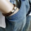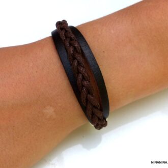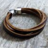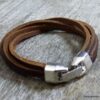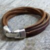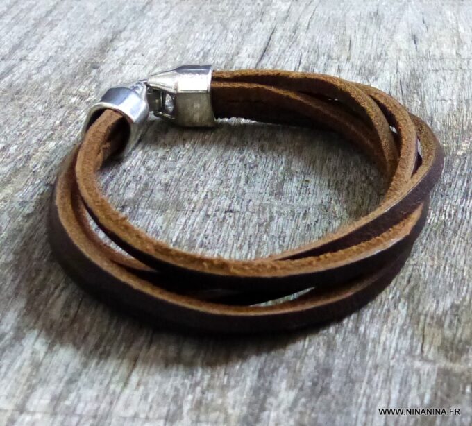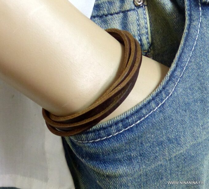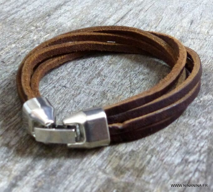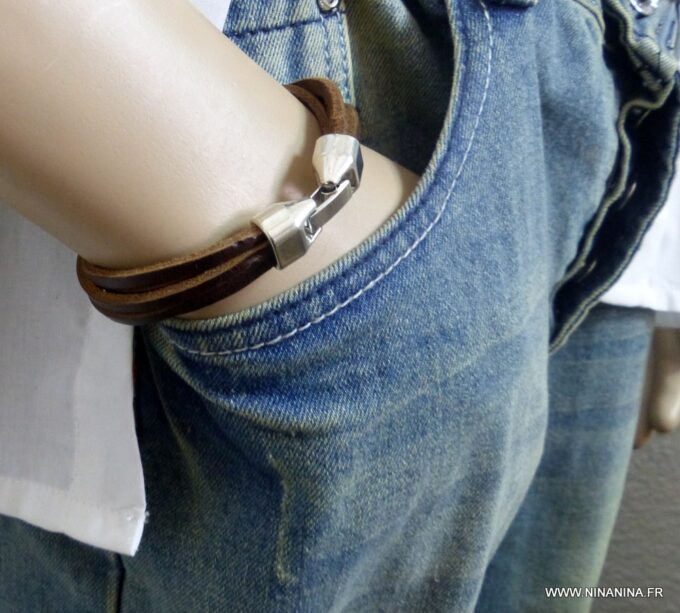 Bracelet homme cuir multiliens composé de 6 lanières de cuir marron chocolat montées sur un fermoir rectangulaire en métal argenté.