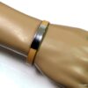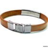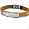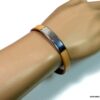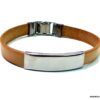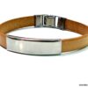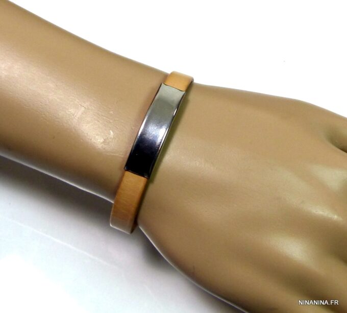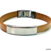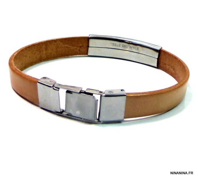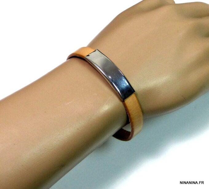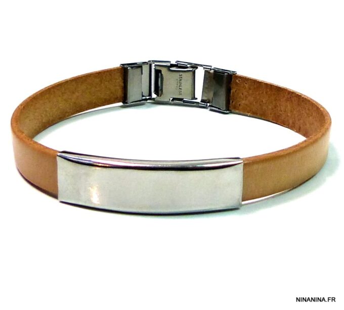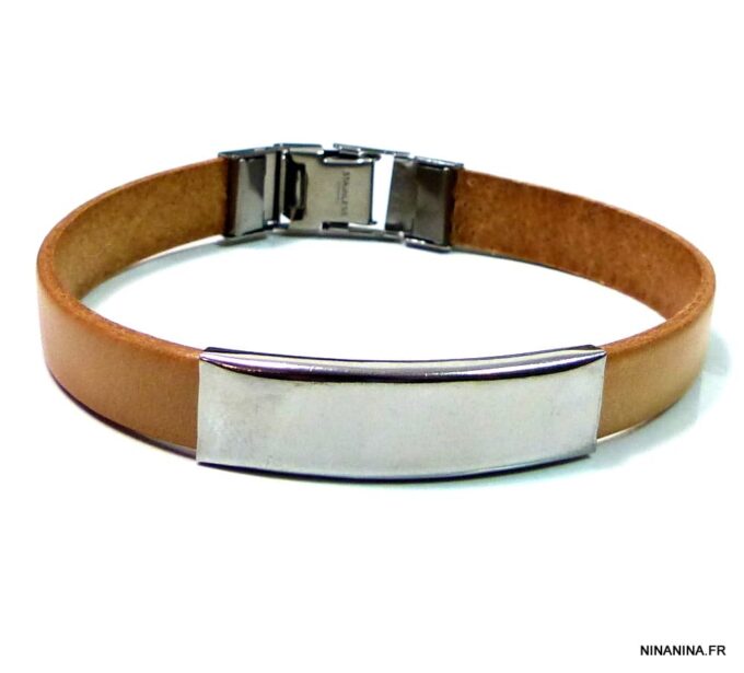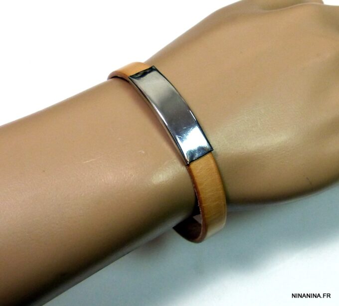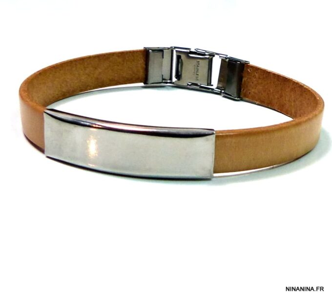 Bracelet gourmette cuir plaque métal argenté composé d’une plaque en métal argenté coulissant sur un lien en cuir naturel (10mm de large). Fermoir réglable en acier inoxydable. Dim de la plaque : 4 X 1 cm. Longueur totale (fermoir compris) : 21 cm ajustable. Livré dans sa pochette d’organza.