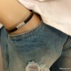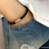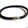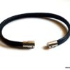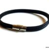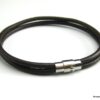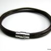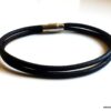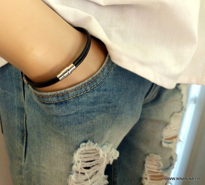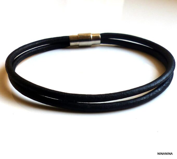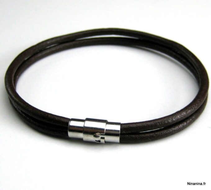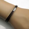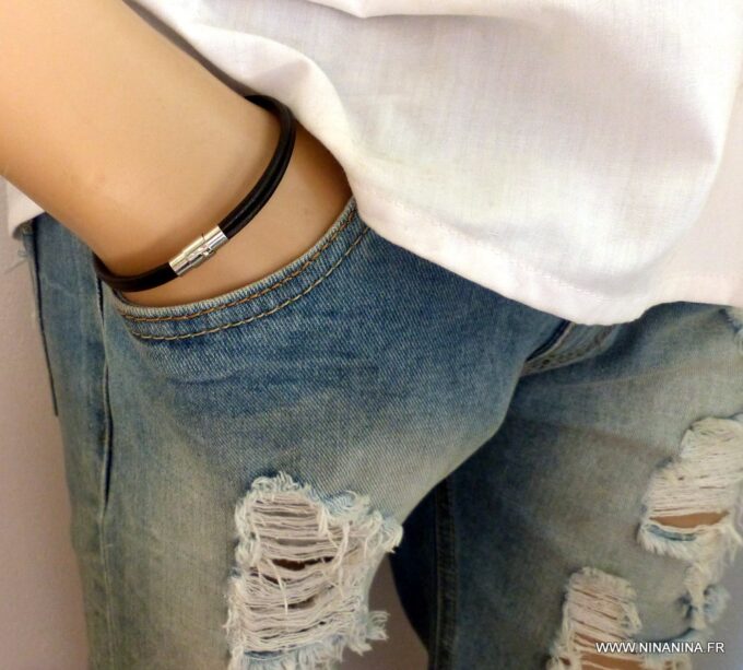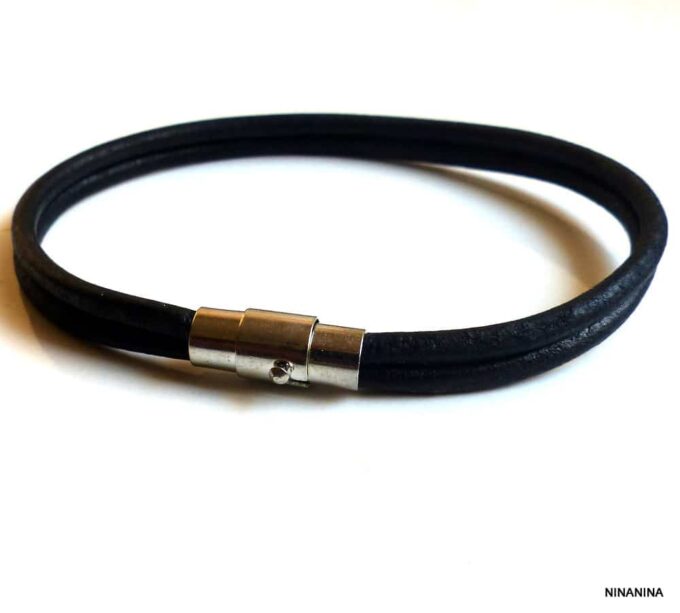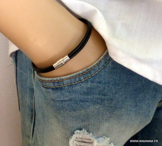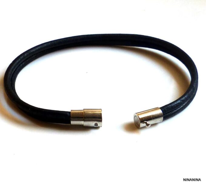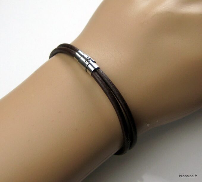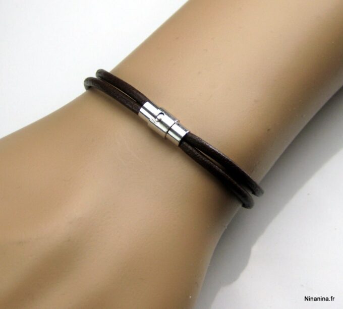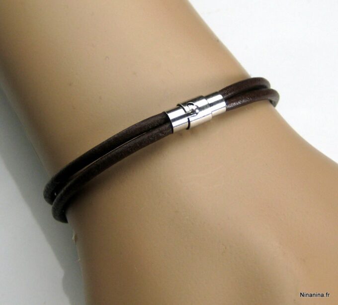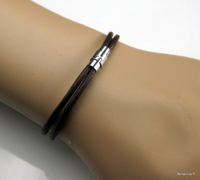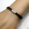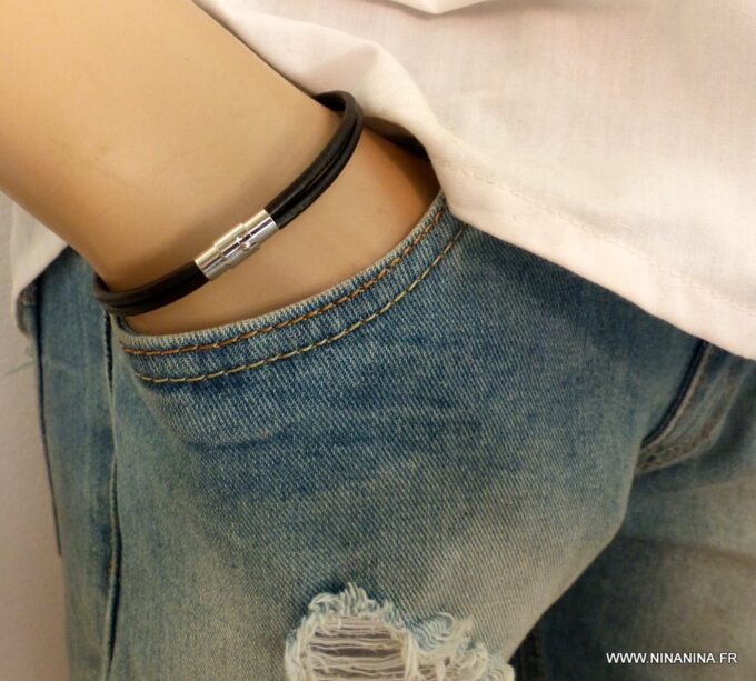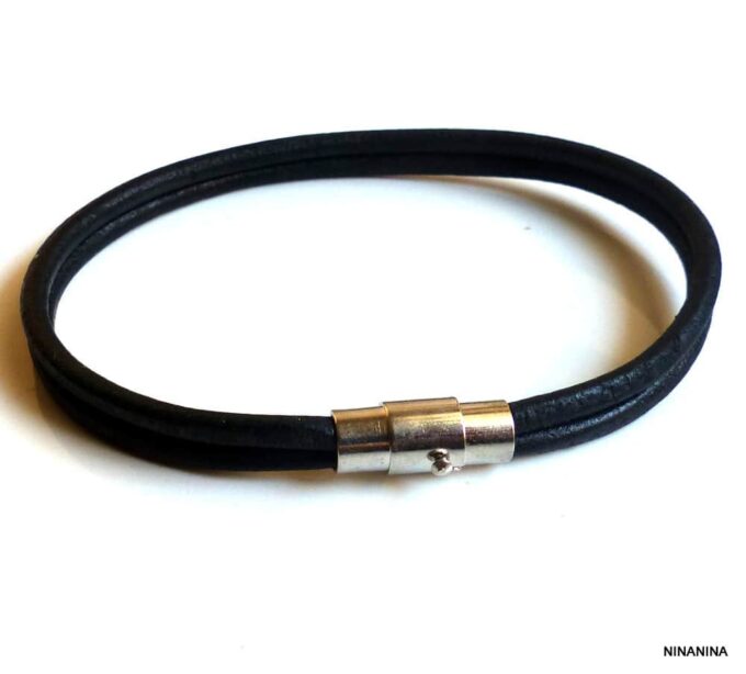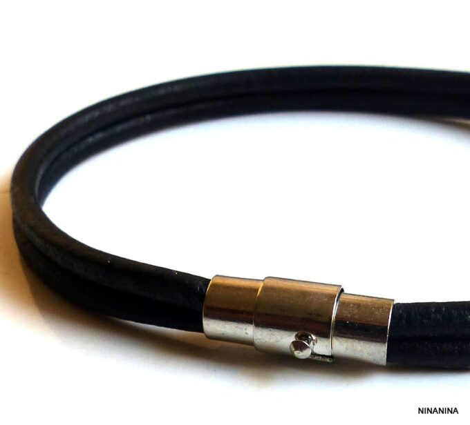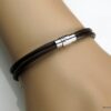 Bracelet homme cordon cuir composé d’un fermoir magnétique rectangulaire en métal argenté monté sur un double cordon de cuir noir (3 mm de diamètre).