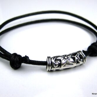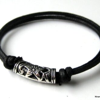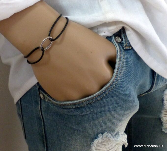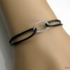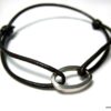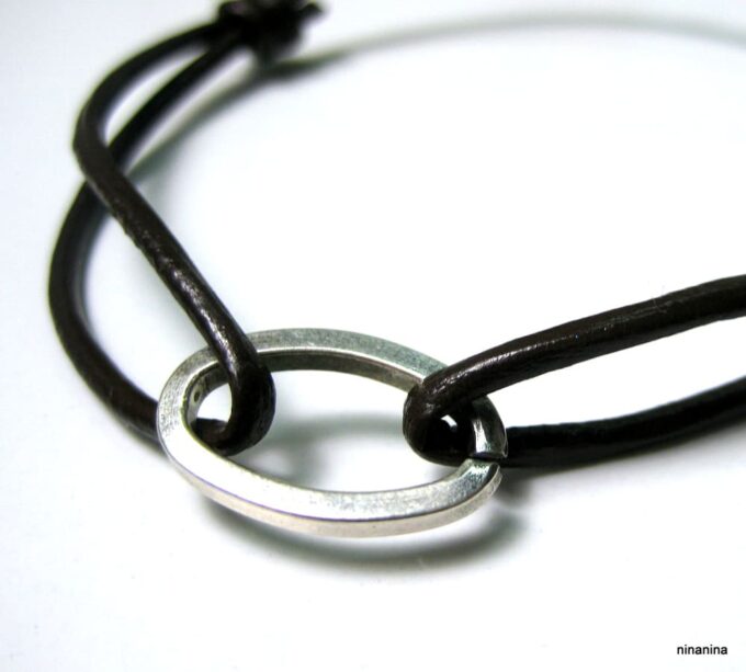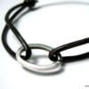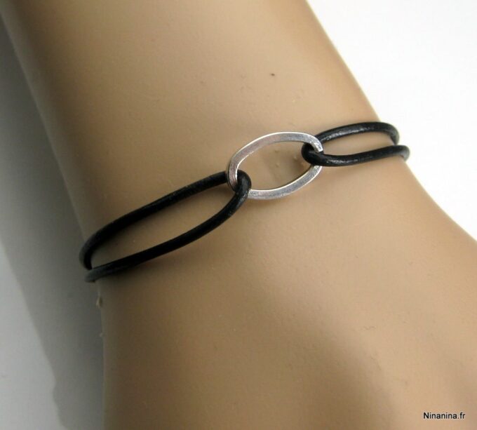 Bracelet cordon cuir anneau ovale métal argenté composé d’un anneau ovale en métal argenté vieilli monté sur un cordon en cuir (2mm de diamètre).