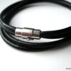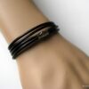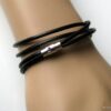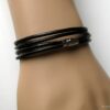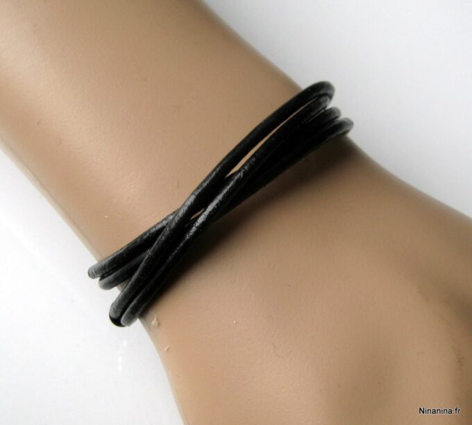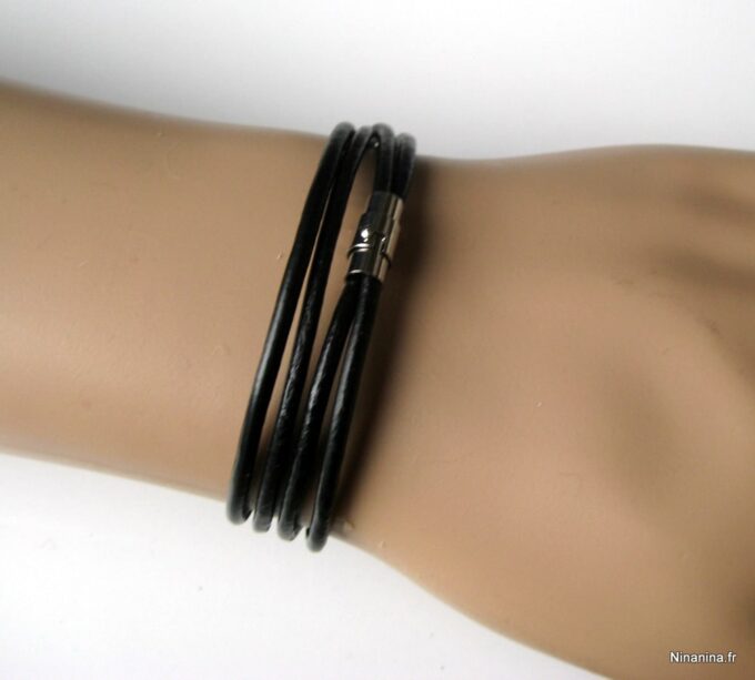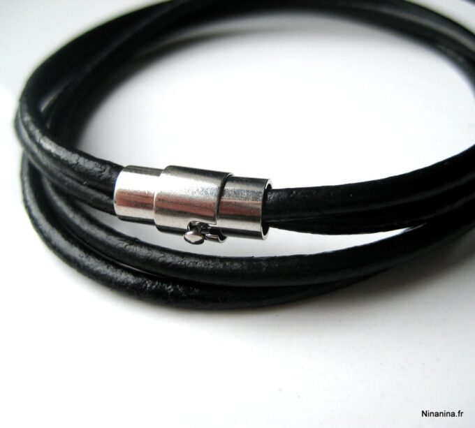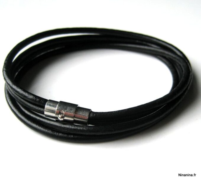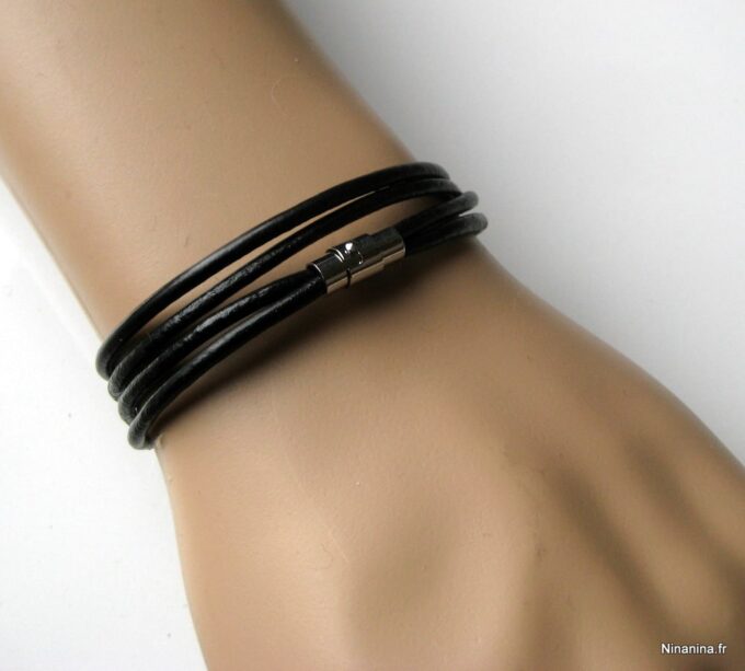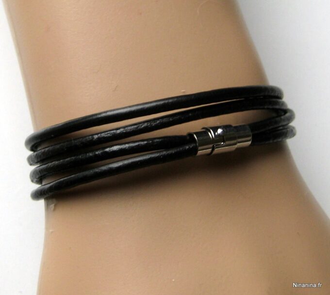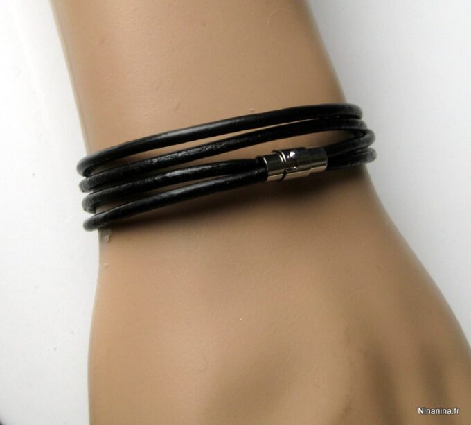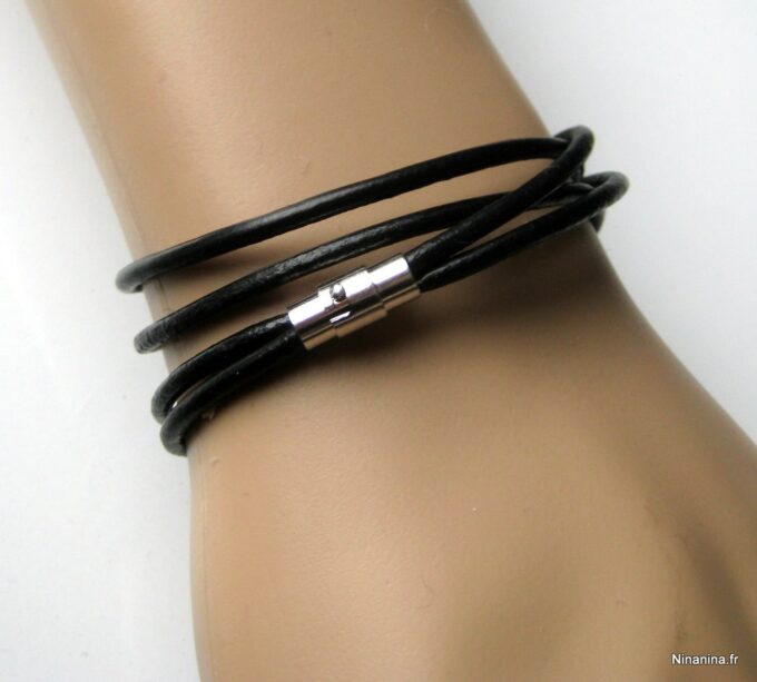 Bracelet homme cuir 3 tours fermoir spirale argenté