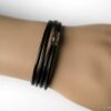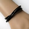 Bracelet cordon cuir fermoir magnétique composé d’un fermoir magnétique rectangulaire en métal argenté monté sur un quadruple cordon de cuir noir (3 mm de diamètre). Dim du fermoir : 1,5 X 1 cm. Existe aussi en marron chocolat, gris et rouge. Longueur : 42 cm env. Livré dans sa pochette d’organza