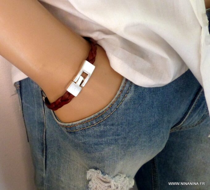 Bracelet homme cuir tressé marron et métal argenté composé d’un bandeau de cuir marron chocolat tressé monté sur un fermoir en métal argenté.