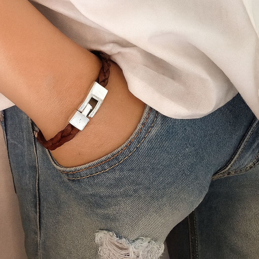 Bracelet Homme en Cuir Marron Tressé – Fermoir Rectangulaire Argenté & Style Authentique