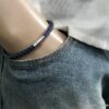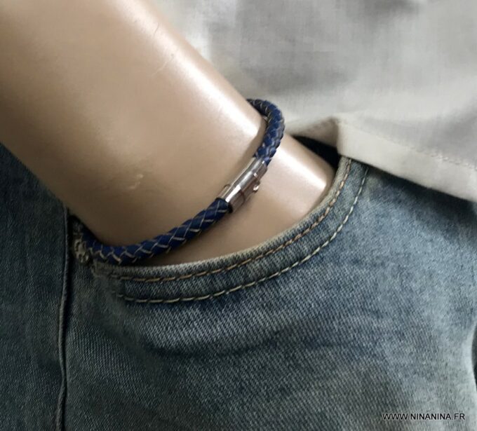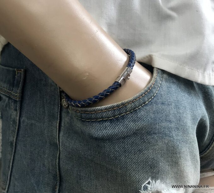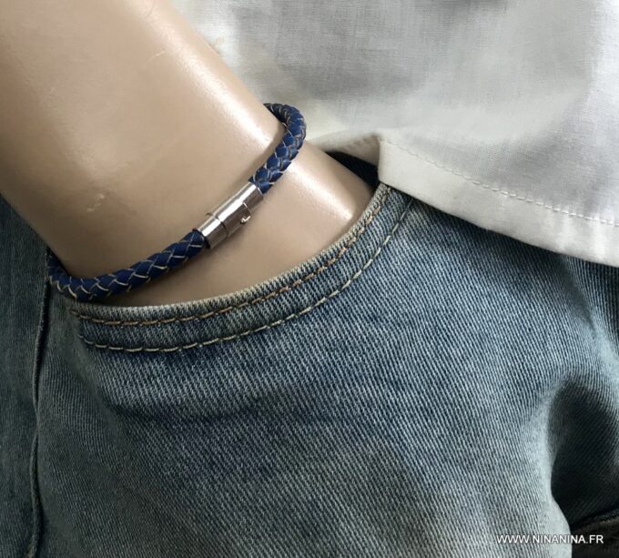 Bracelet homme acier bleu cuir tressé fermoir magnétique