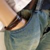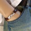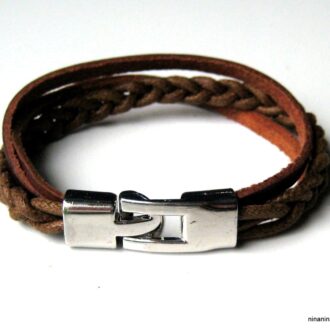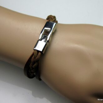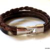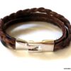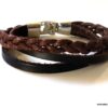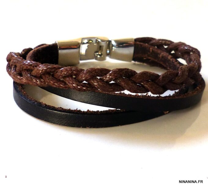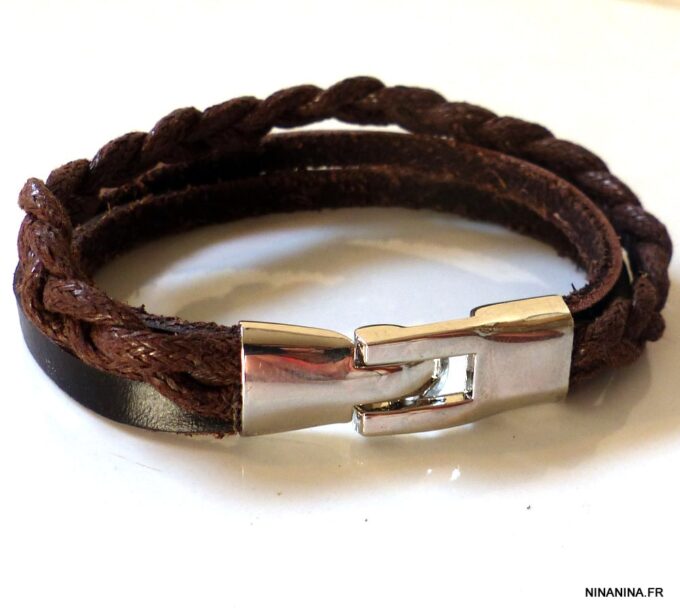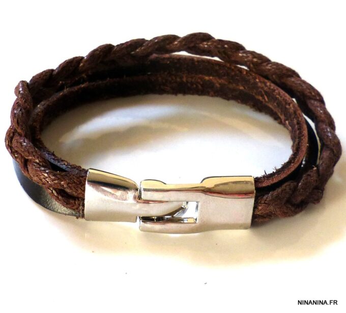 Bracelet homme cuir tressé et lisse fermoir métal argenté composé de 2 lanières de cuir et d’une tresse de coton ciré marron chocolat montées sur un fermoir rectangulaire en métal argenté.