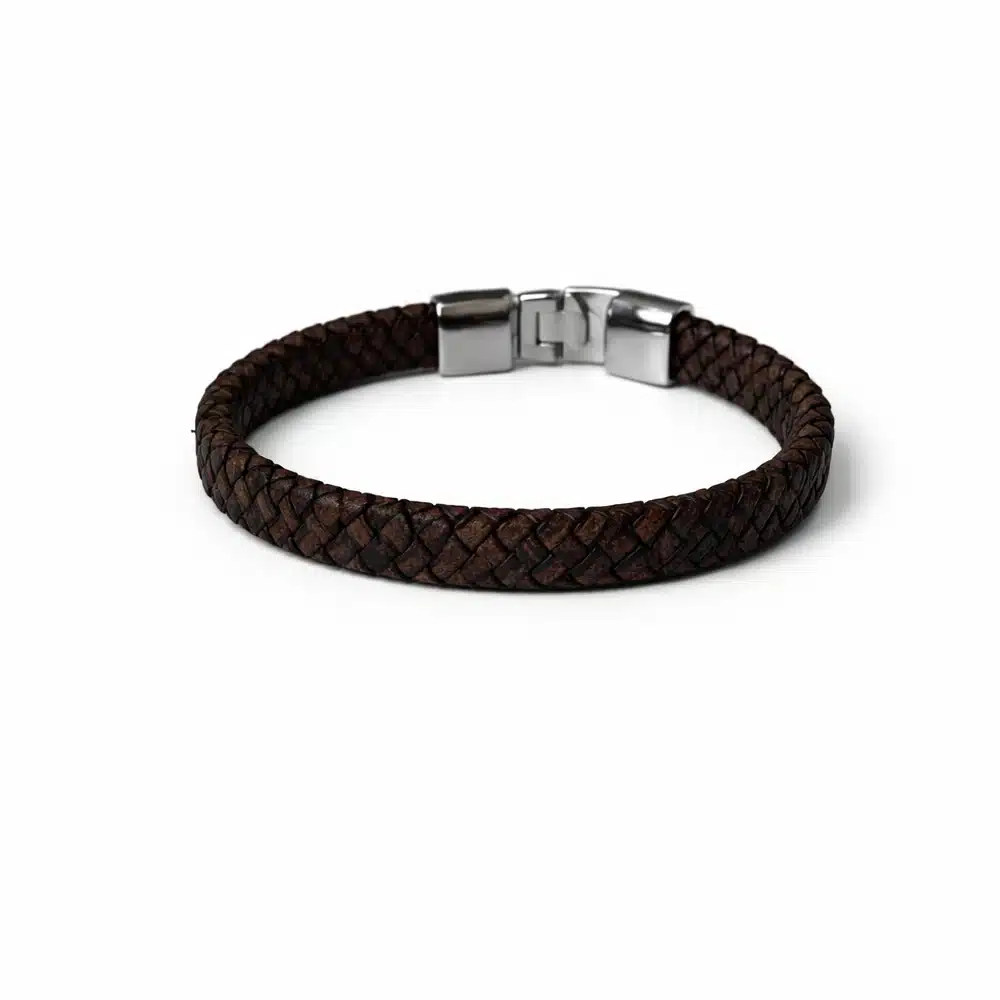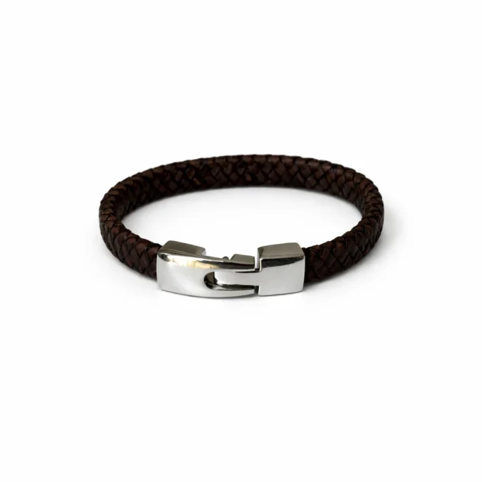 Bracelet en cuir plat tressé marron avec fermoir rectangulaire argenté. Bijou élégant, confortable et intemporel, parfait au quotidien ou comme idée cadeau. Un bracelet au design épuré qui associe la chaleur du cuir marron à la modernité d’un fermoir argenté, pour un look sobre et affirmé.