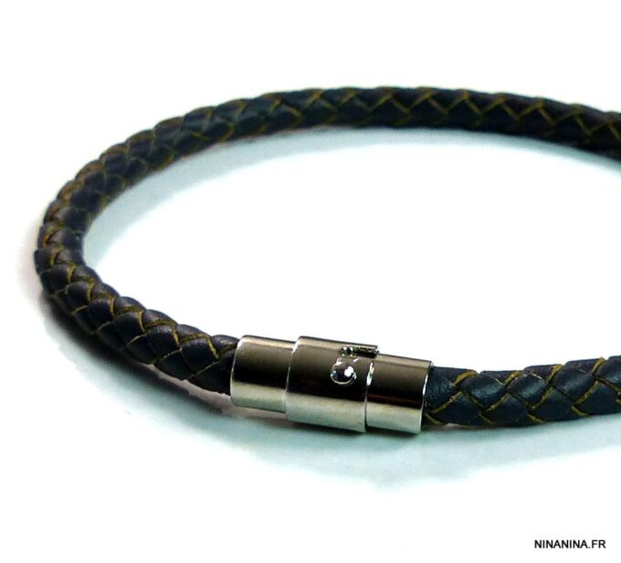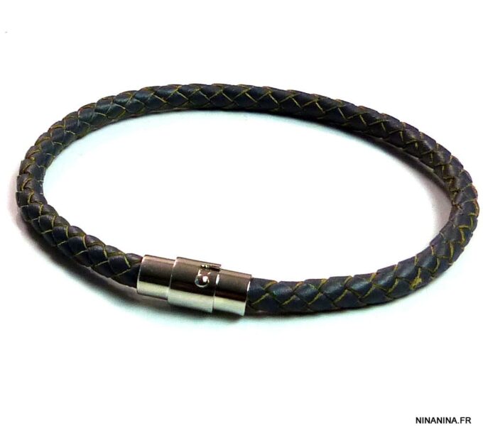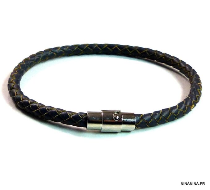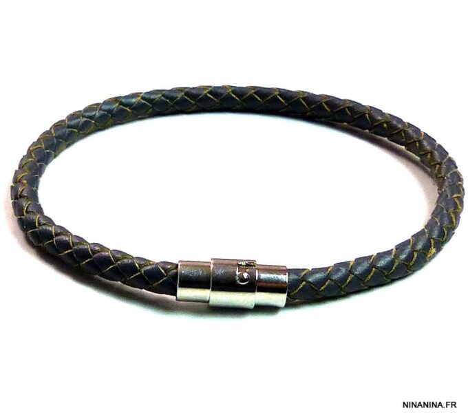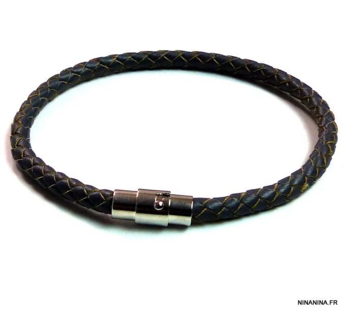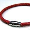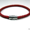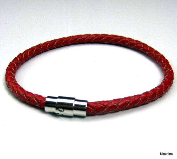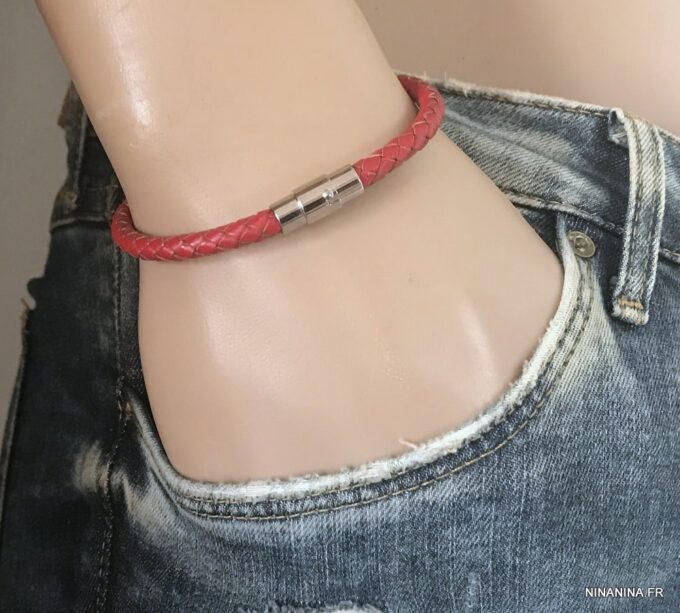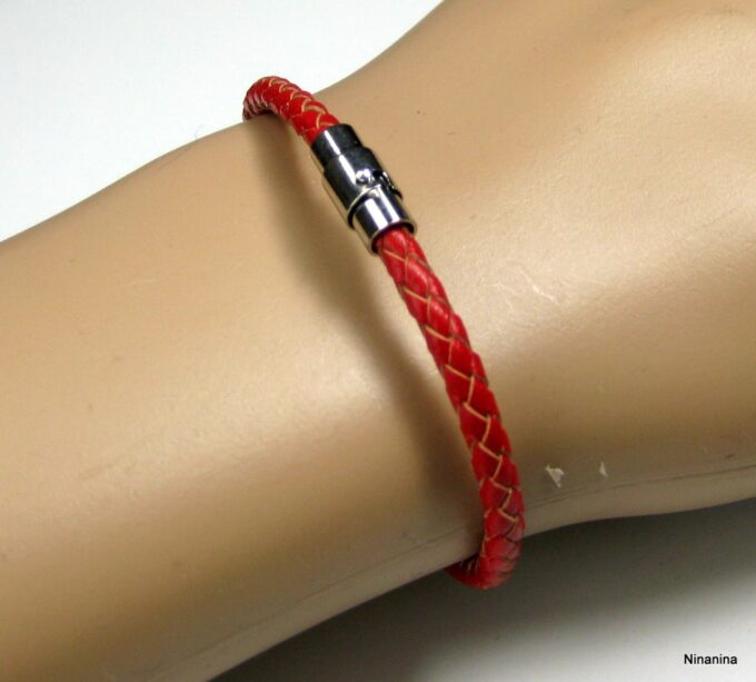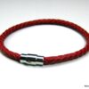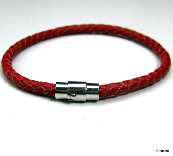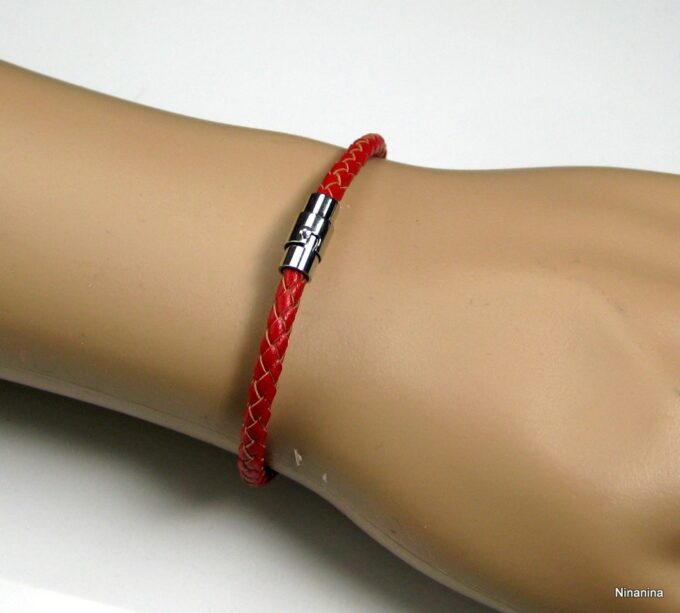 Bracelet cuir rouge tressé homme femme Acier inoxydable composé d’un cordon de cuir tressé rouge (4 mm de diamètre) terminé par un fermoir magnétique aimanté en acier inoxydable.