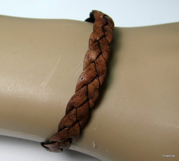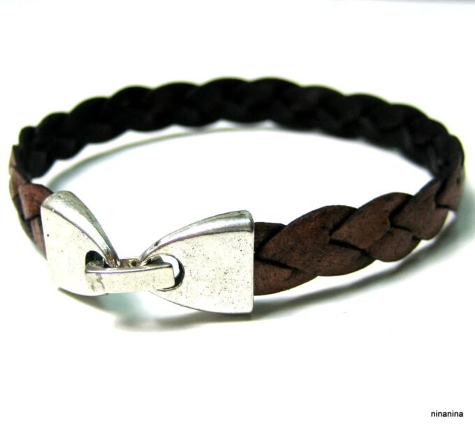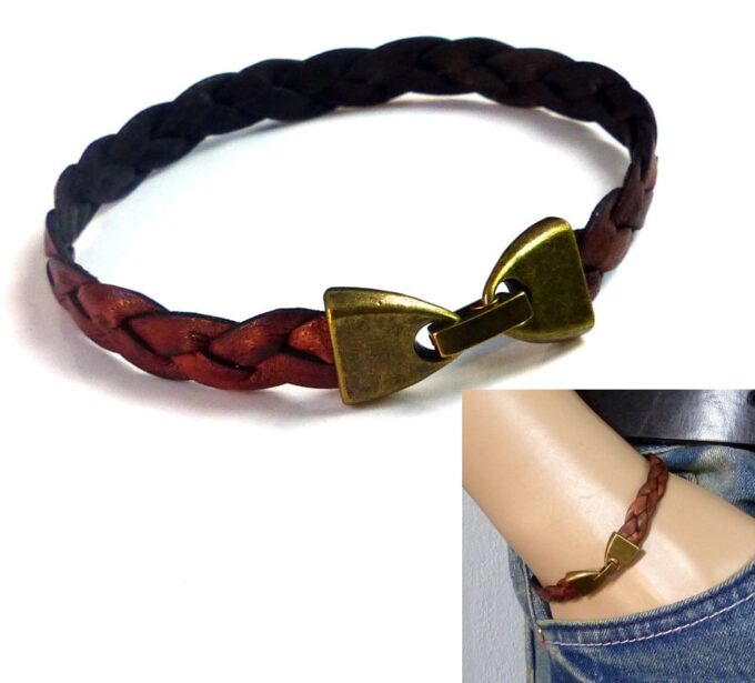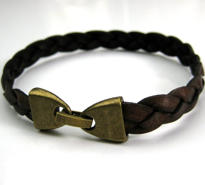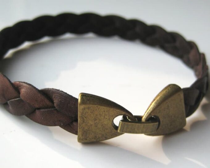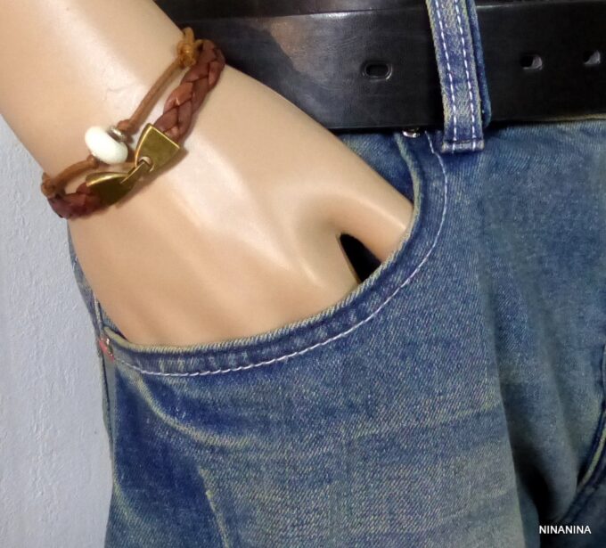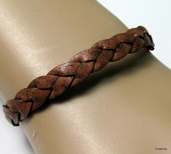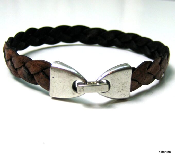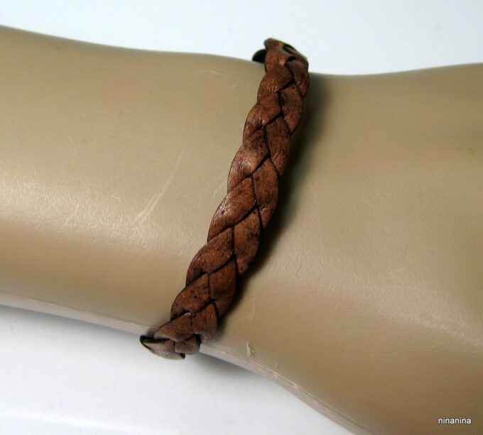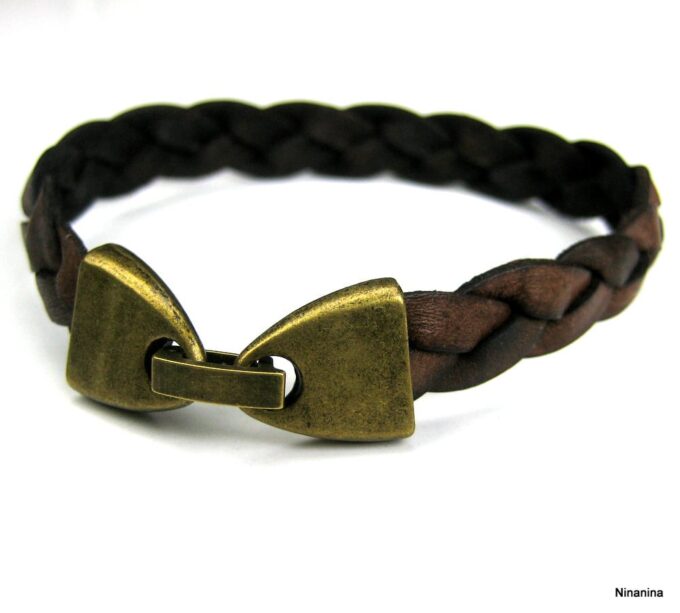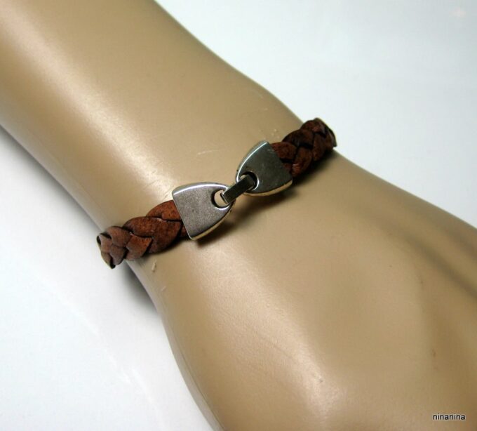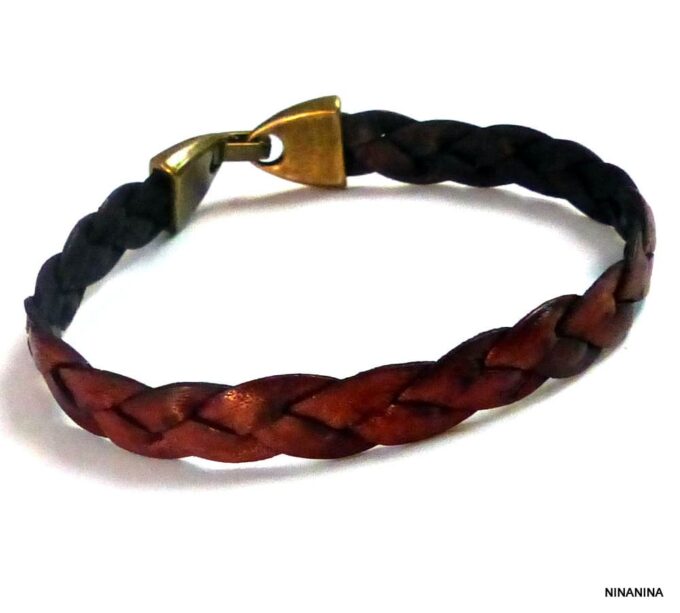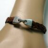 Bracelet homme cuir tressé marron métal bronze composé d’un bandeau de cuir marron tressé monté sur un fermoir en métal bronze.