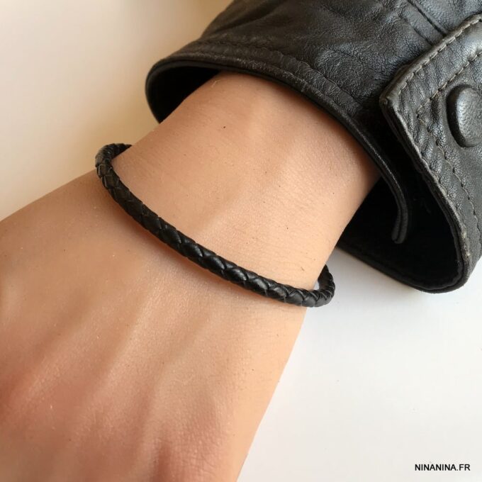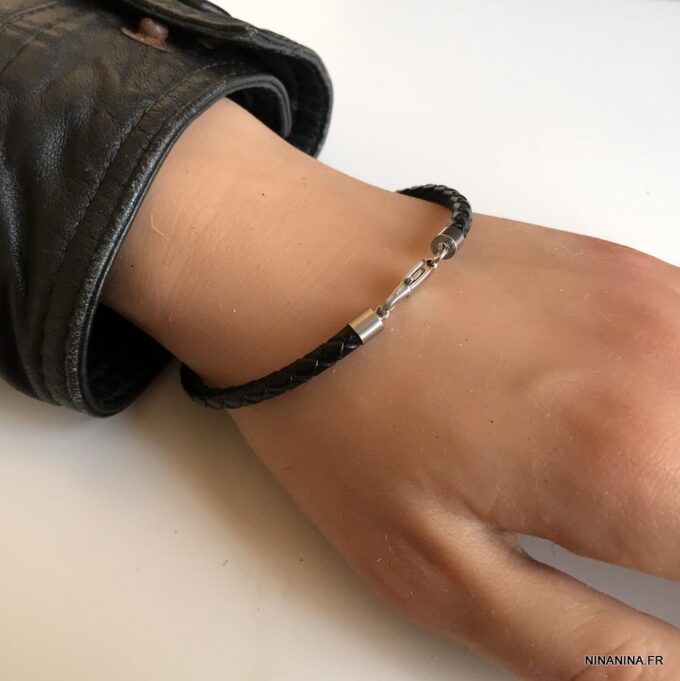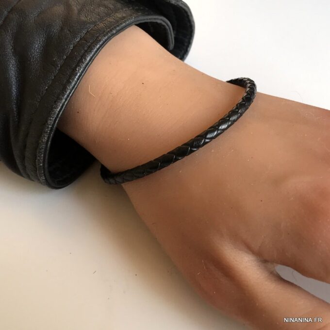 Bracelet homme cuir tressé pas cher noir et acier composé d’un cordon de cuir tressé noir (4 mm de diamètre) terminé par un fermoir en acier inoxydable.