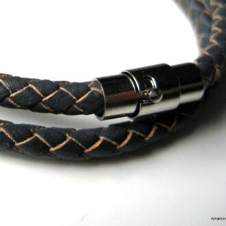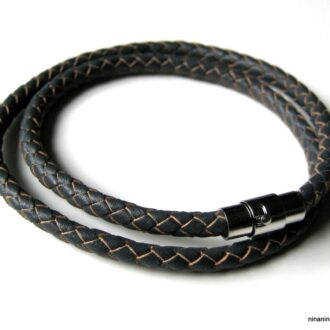 Bracelet cuir tressé 2 tours composé d’un cordon de cuir tressé gris (4 mm de diamètre) terminé par un fermoir métal argenté à enrouler au tour du poignet. Existe aussi en noir, rouge, bleu nuit et marron chocolat. Longueur (fermoir compris) : 41 cm env. Livré dans sa pochette d’organza.