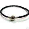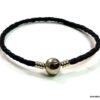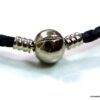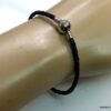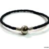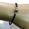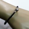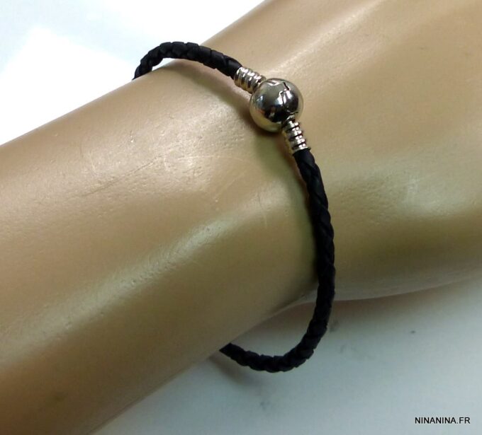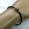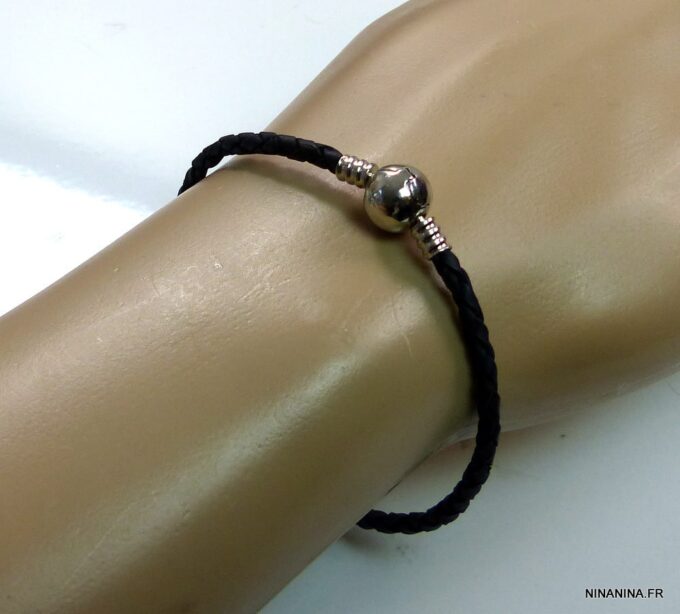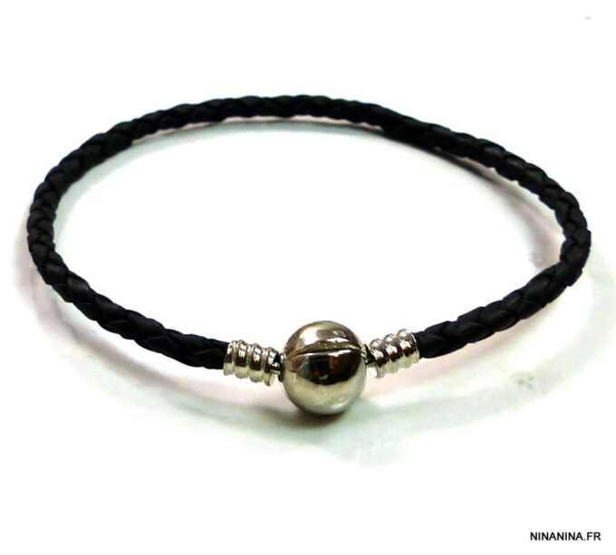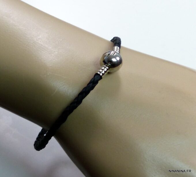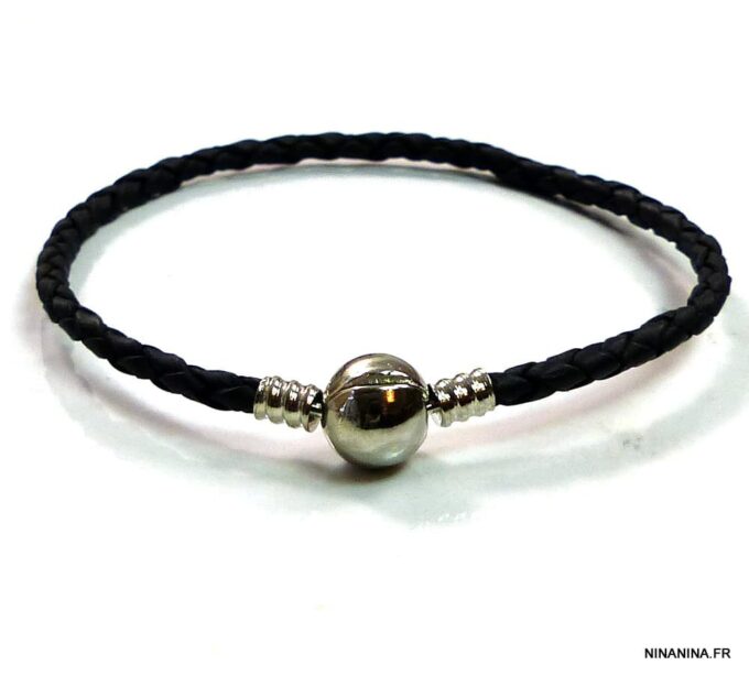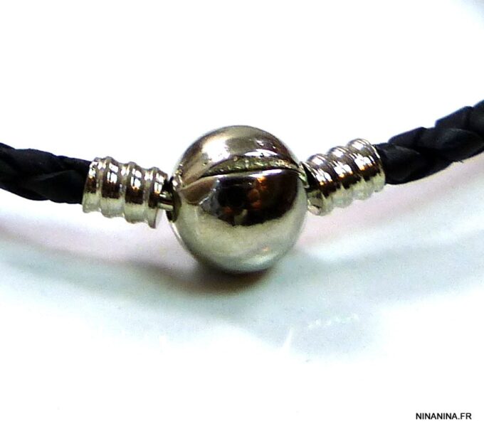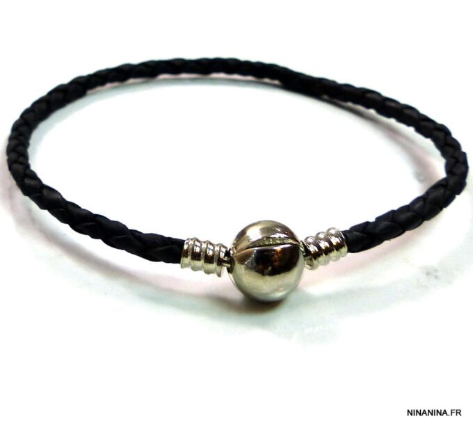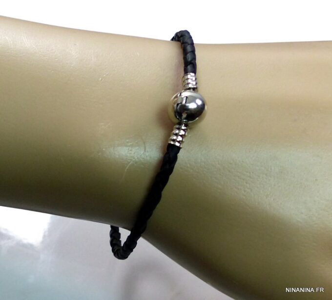 Bracelet cordon cuir tressé fermoir boule composé d’un fermoir boule en métal argenté monté sur un cordon de cuir tressé noir (3 mm de diamètre). Diamètre du fermoir : 1 cm. Longueur : 21 cm (homme) et 19 cm (femme) – toute autre longueur possible à indiquer en commentaire. Livré dans sa pochette d’organza. Bijou 100% fait main.
