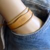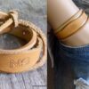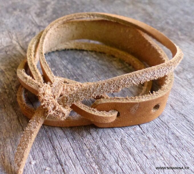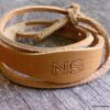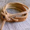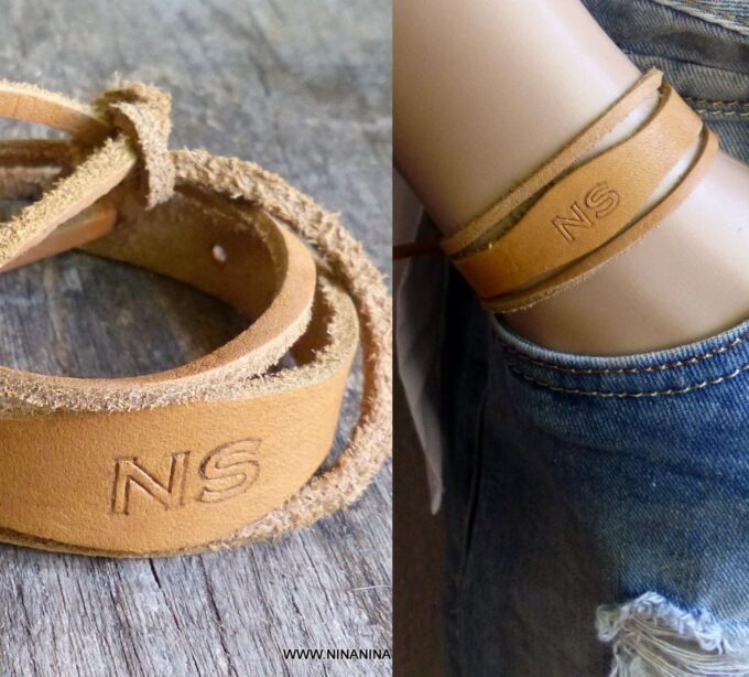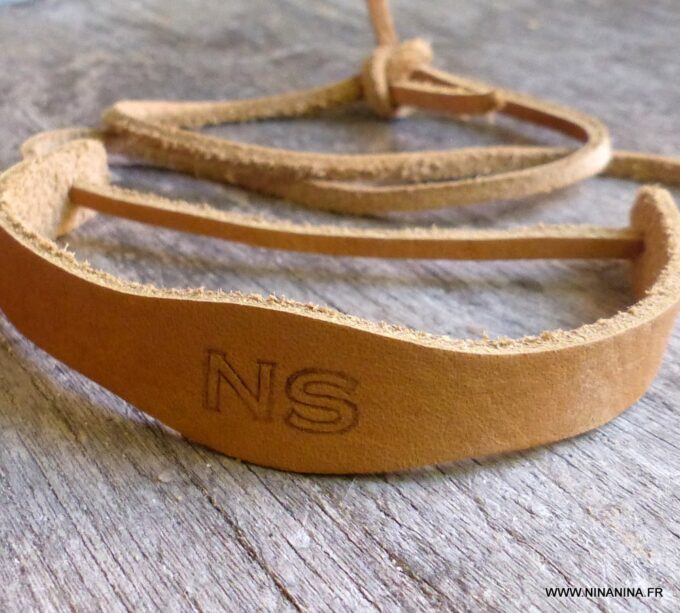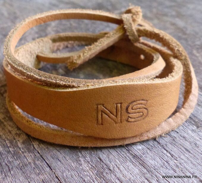 Bracelet homme cuir wrap personnalisé initiales composé d’un bandeau et d’une lanière de cuir marron clair, à enrouler autour du poignet (3 tours).