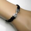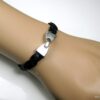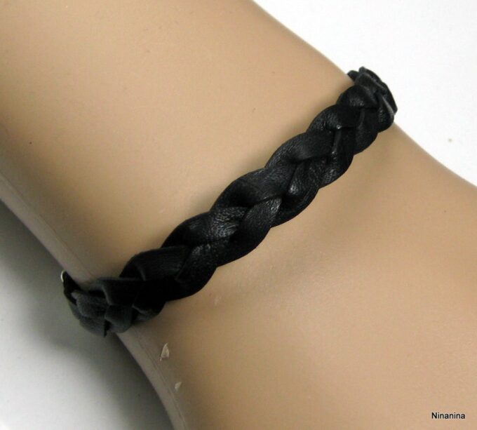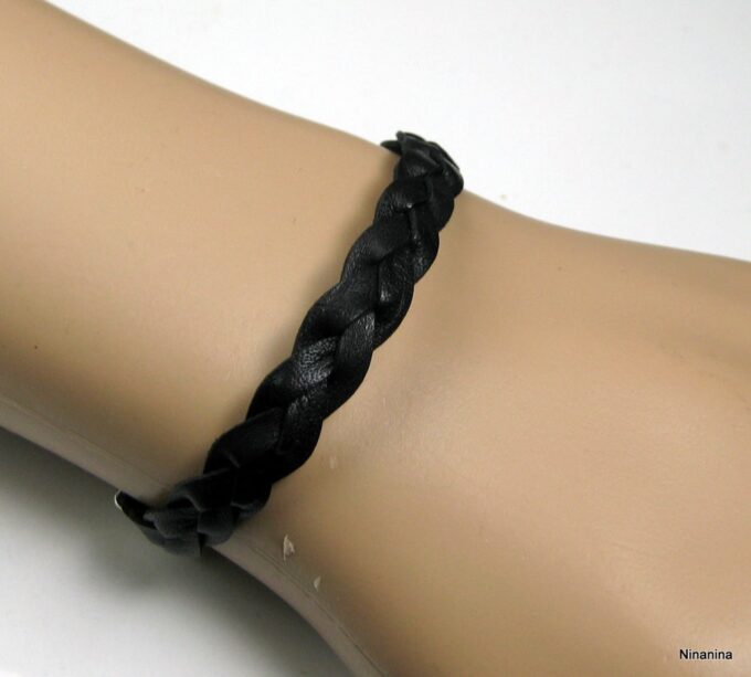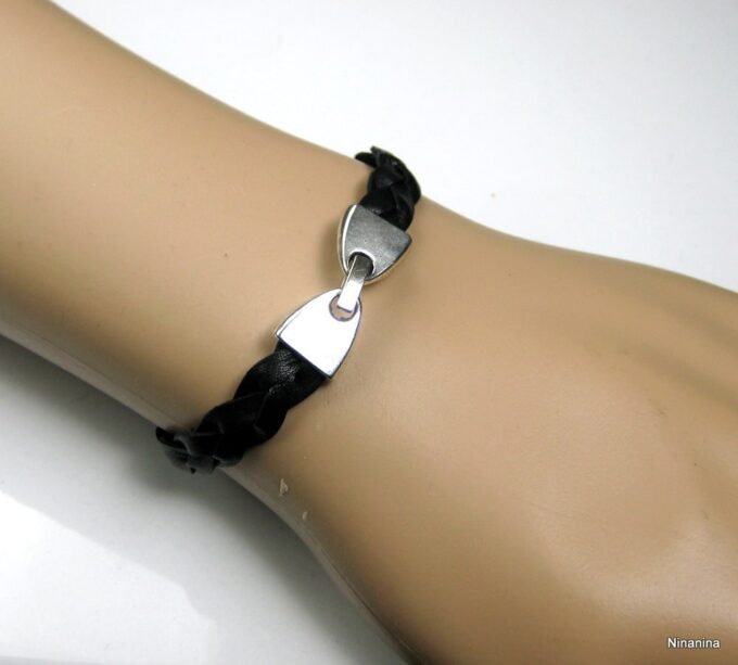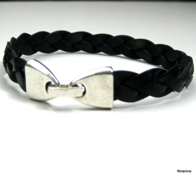 Bracelet en cuir tressé homme fermoir métal argenté composé d’un bandeau de cuir tressé noir monté sur un fermoir en métal argenté. Largeur du bandeau : 9 mm. Existe aussi avec un fermoir en métal bronze et un bandeau marron chocolat. Longueur (fermoir compris) : 21 cm env. Livré dans sa pochette d’organza. Bijou 100% fait-main