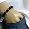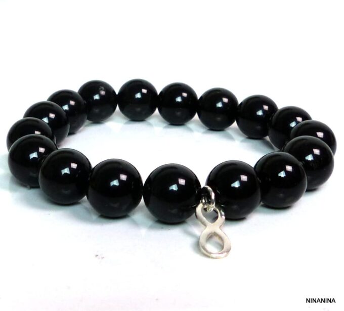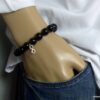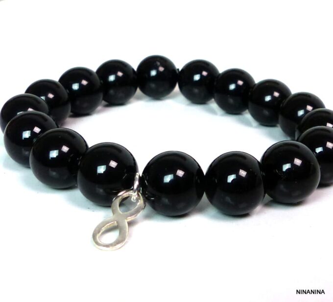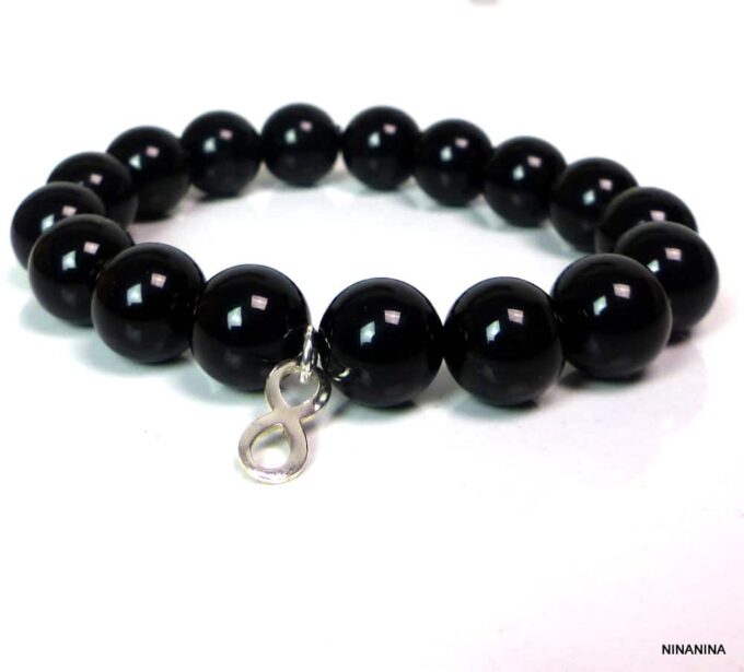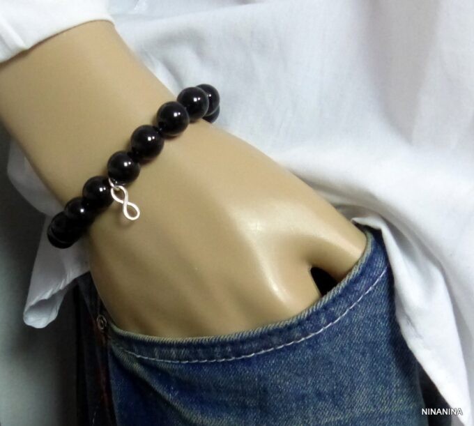 Bracelet infini homme Argent 925 massif perles bois composé de perles agate noires et d’un symbole infini en argent 925 montés sur un elastique resistant.