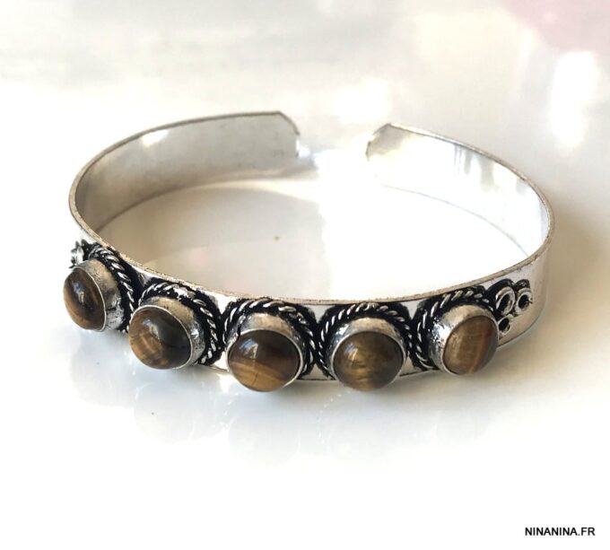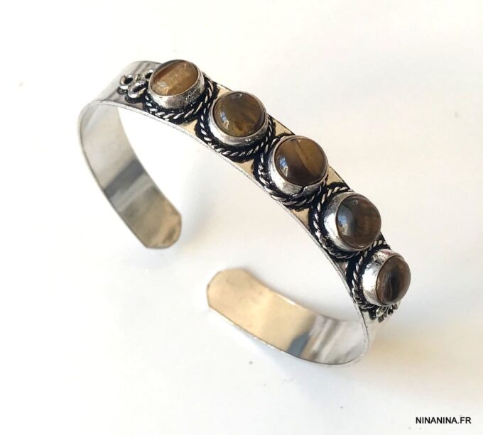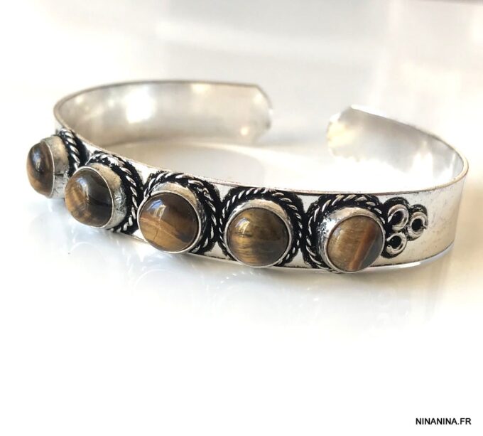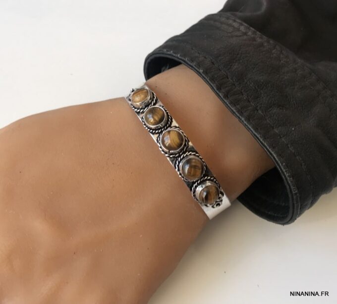 Un bijou mixte serti de cinqx très beaux cabochons ronds en oeil de tigre véritable, ce bracelet manchette en pierre naturelle saura imposer sa délicatesse, son exotisme et son raffinement au poignet d’un homme.