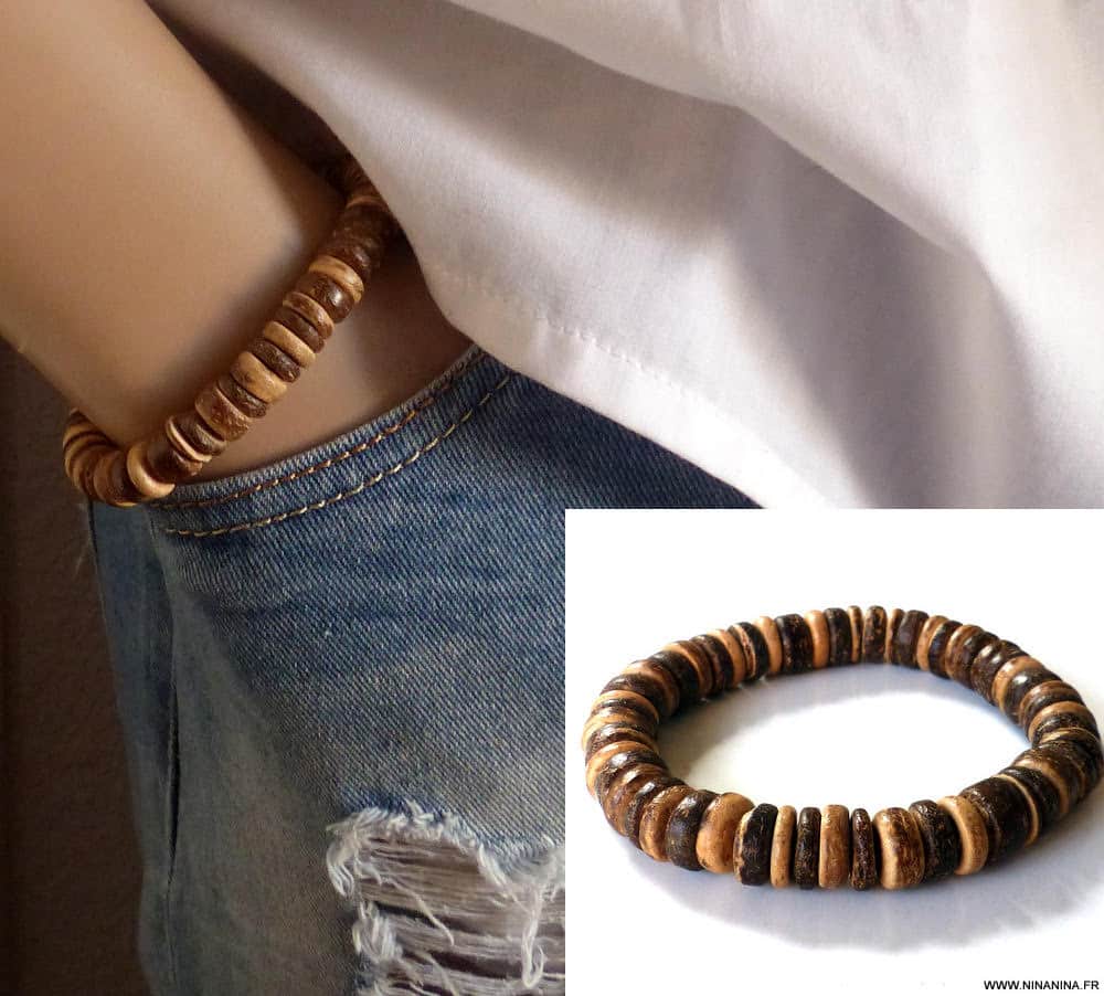 Bracelet homme perle coco sur fil elastique composé de rondelles de bois marron chocolat et naturel montées en alternance sur un lien elastique.