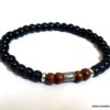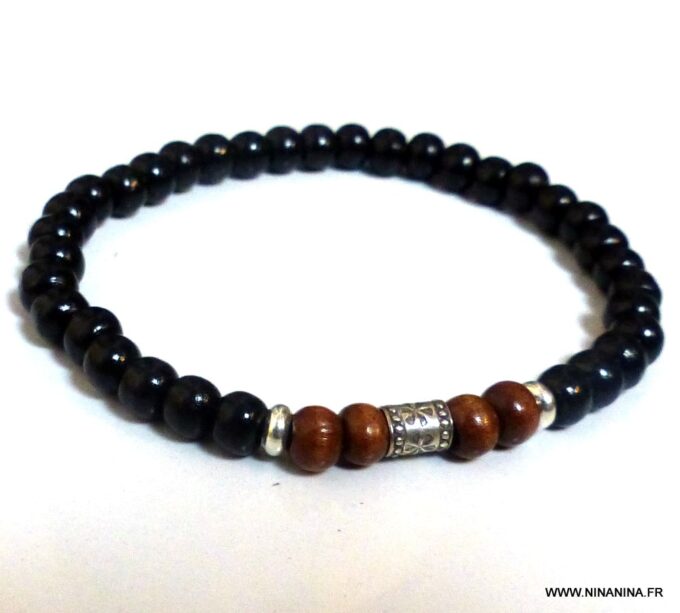 Bracelet homme perles bois argent massif composé de perles de bois rondes noires et marron clair, de deux rondelles et d’une perle tube en argent 925 montés sur un lien elastique.