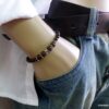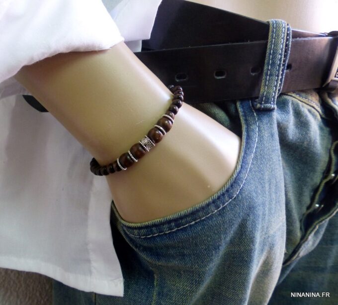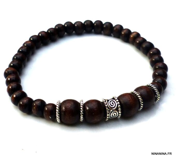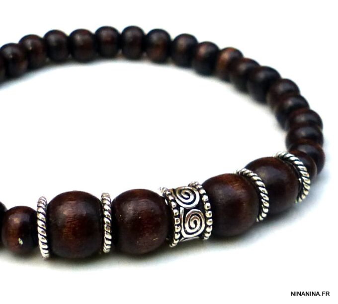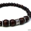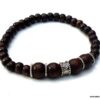 Bracelet homme perle bois Argent 925 massif composé de perles de bois rondes marron chocolat et de rondelles en argent 925 montées sur un lien elastique. Diamètre des perles : 0,6 et 0,8 cm.