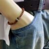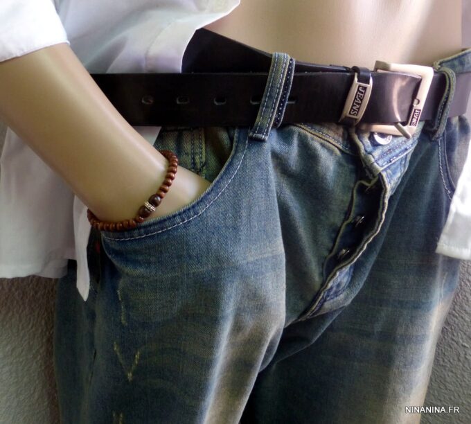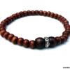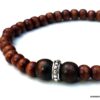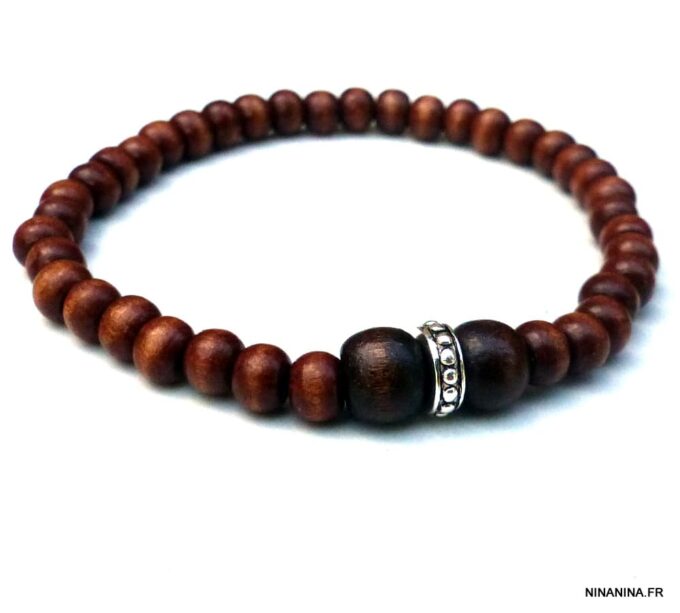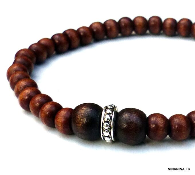 Bracelet perle Argent 925 massif et boules en bois composé de perles de bois rondes marron clair et chocolat et d’une rondelle ciselée en argent 925 montées sur un lien elastique.