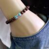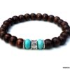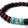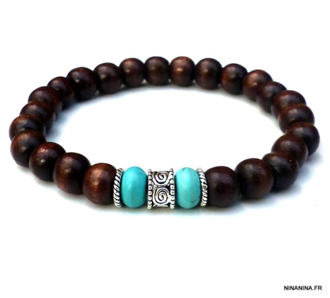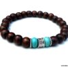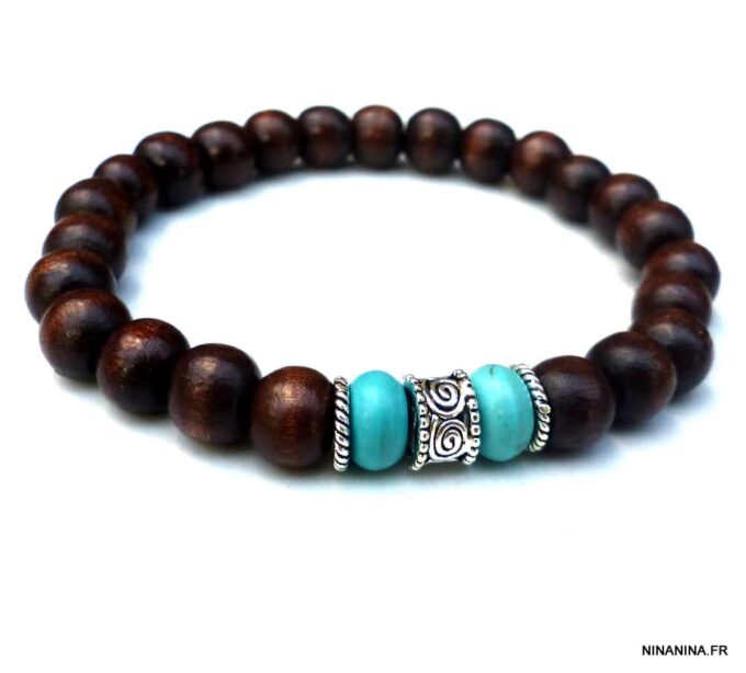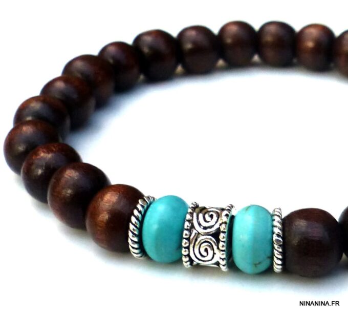 Bracelet perle bois Argent 925 massif Turquoise naturelle composé de perles de bois rondes marron chocolat, de turquoises naturelles et de rondelles en argent 925 montées sur un lien elastique.
