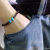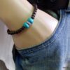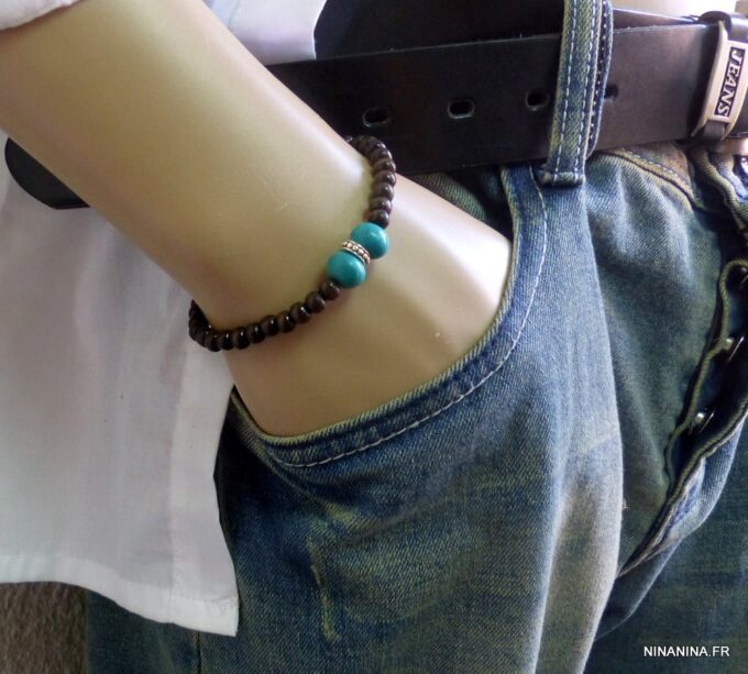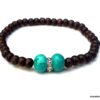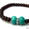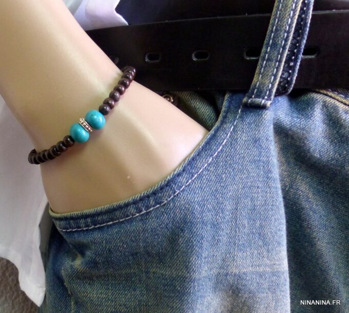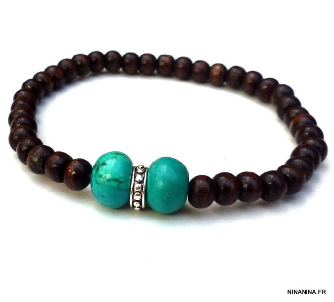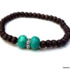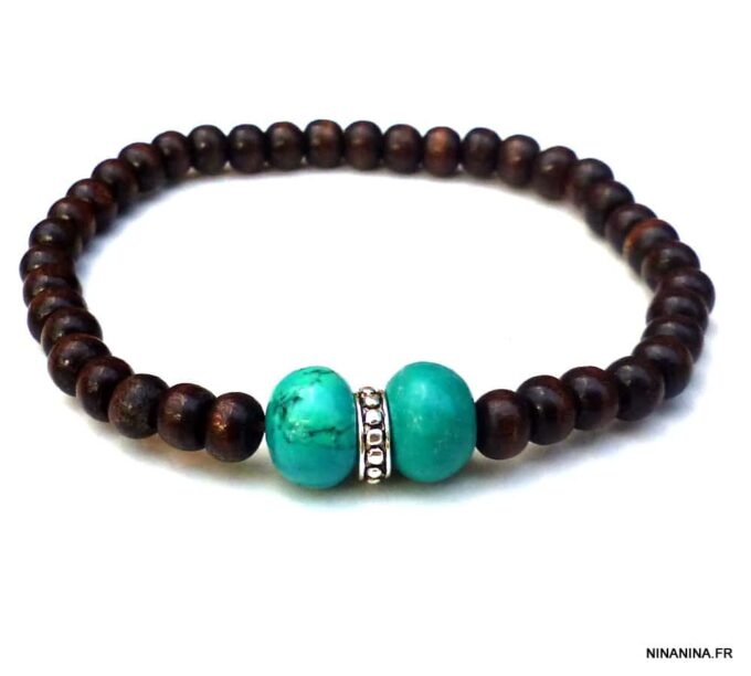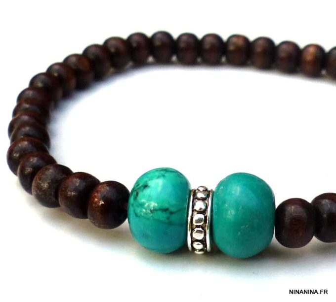 Bracelet perle boisTurquoise naturelle Argent 925 massif composé de perles de bois rondes marron chocolat, de deux turquoises naturelles et d’une rondelle ciselée en argent 925 montés sur un lien elastique.
