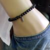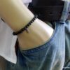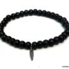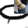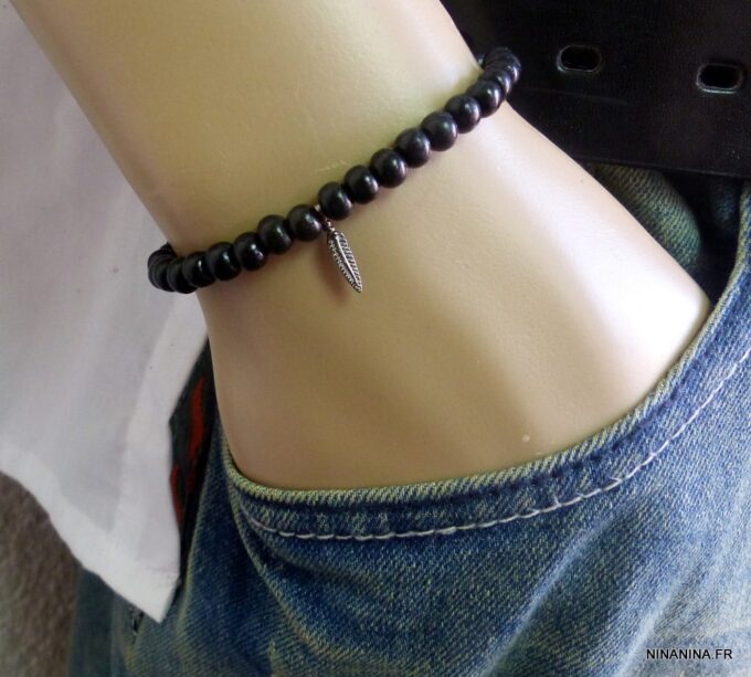 Bracelet avec plume argent et perle bois homme ou femme composé d’une plume en argent 925 vieilli monté sur un rang de perles de bois rondes noires sur un lien elastique.