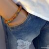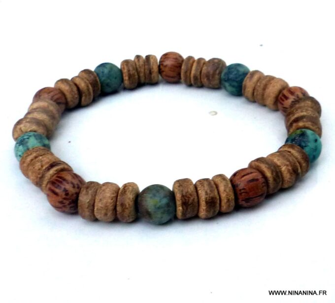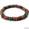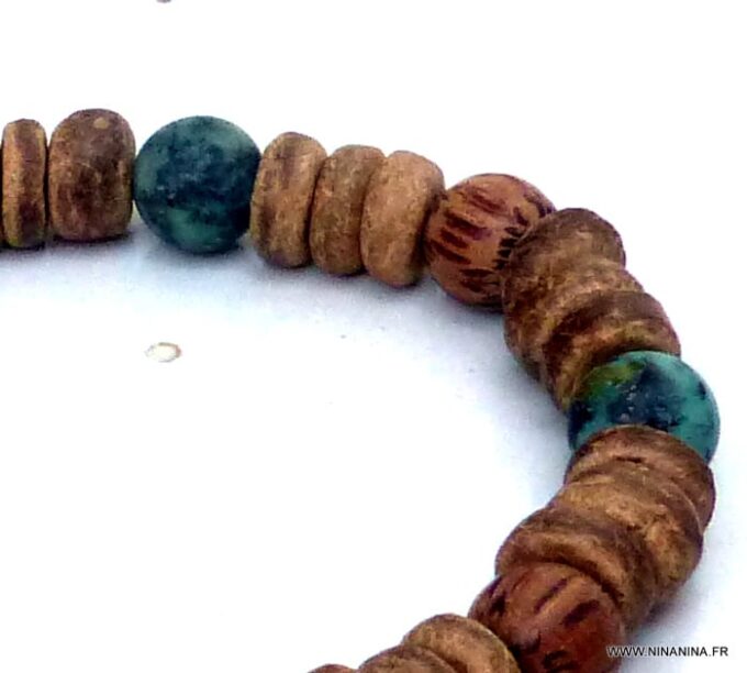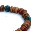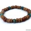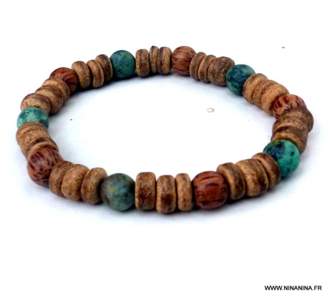 Bracelet perle coco et turquoise africaine naturelle composé de perles turquoises africaines rondes mat, de rondelles en coco marron clair et de perles de bois marron foncé montées sur un lien elastique.