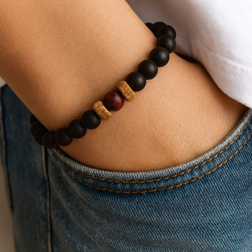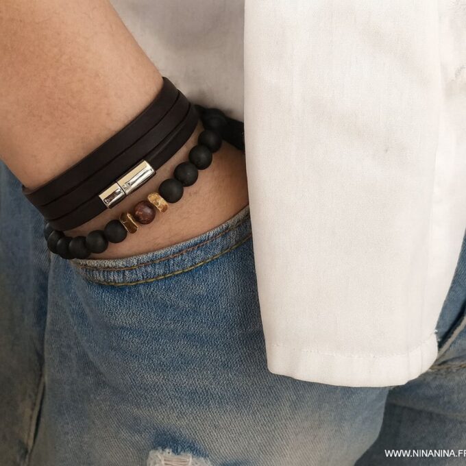 Ce bracelet en Œil de Tigre rouge et Onyx noir se porte facilement avec tous les styles grâce à son design à la fois sobre et puissant. Pour un look masculin moderne, associez-le à une tenue décontractée : jean, t-shirt ou chemise ouverte.