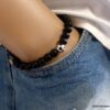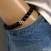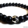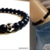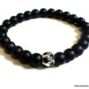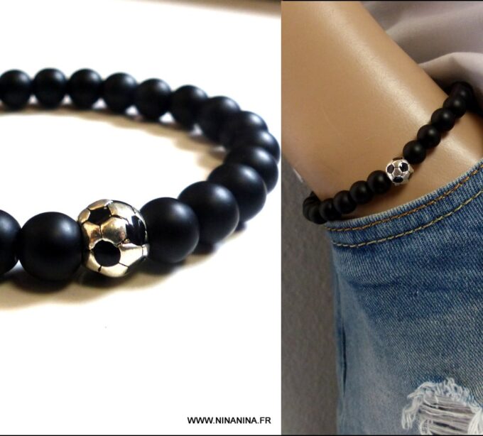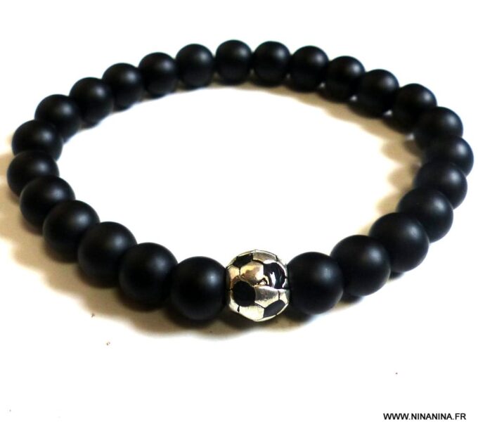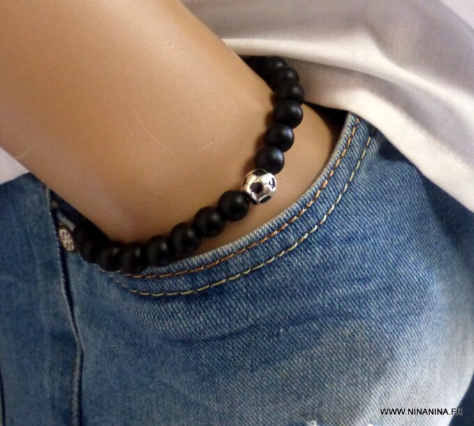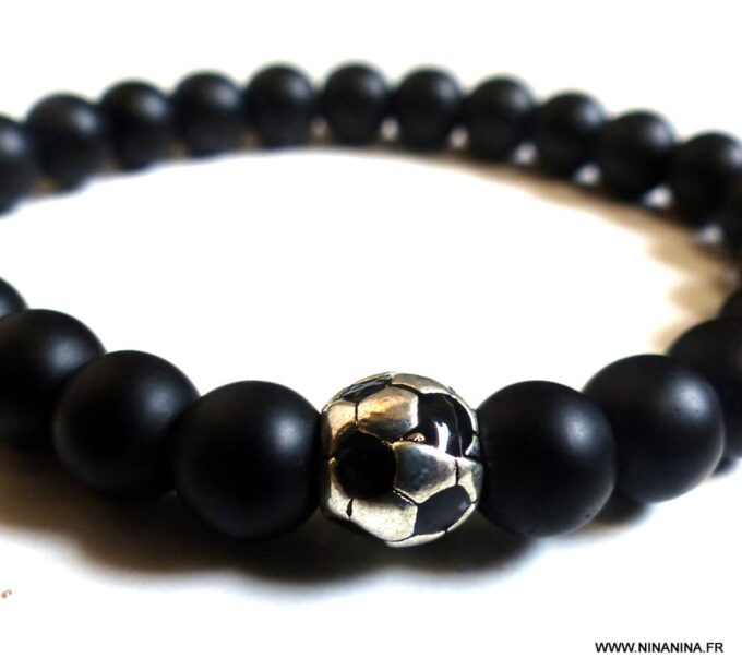 Bracelet homme perle onyx noir ballon de football composé d’une perle ballon de foot en métal noir et argent de de perles onyx noires mat rondes montées sur un lien elastique.
