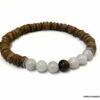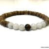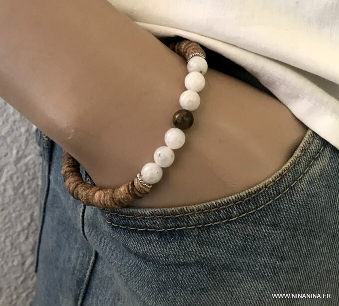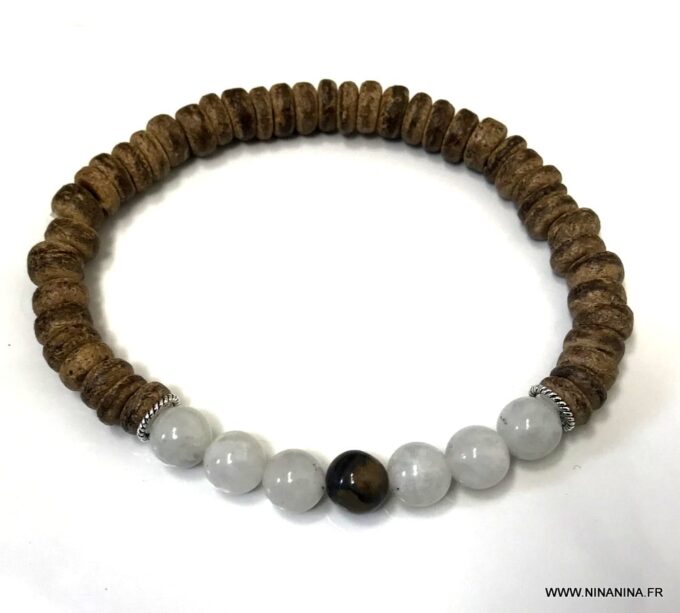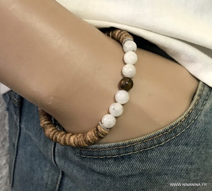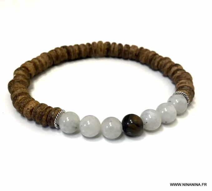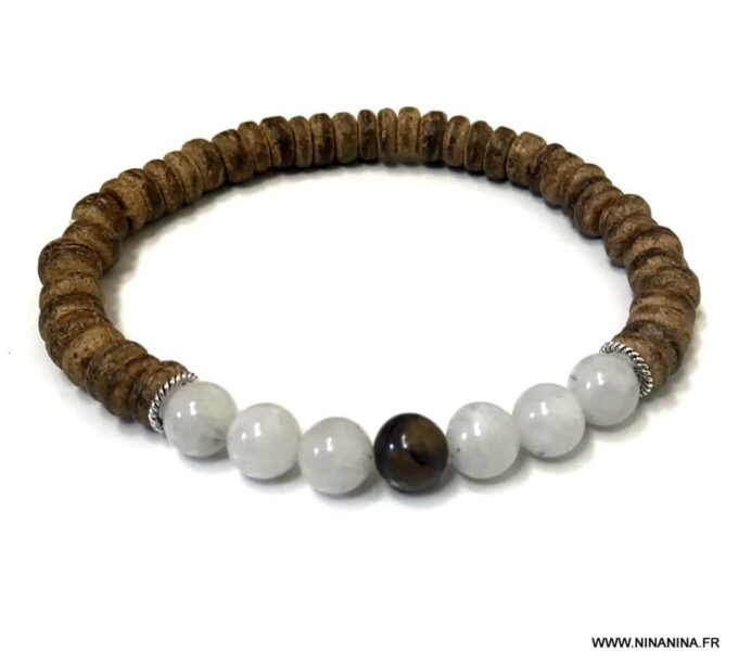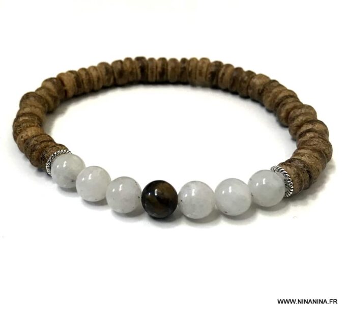 Découvrez sans attendre ce Bracelet homme pierre de lune oeil de tigre et argent constitué de perles en pierre de lune et oeil de tigre véritable, de rondelles en Argent 925 et de rondelles en bois de coco marron clair montées sur un elastique très solide.