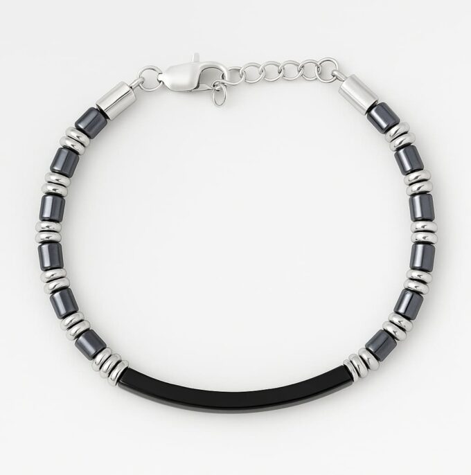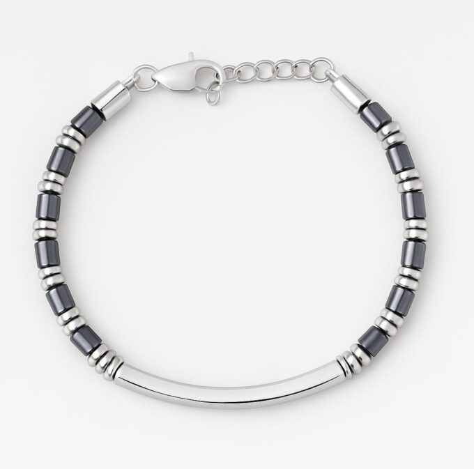 Ce bracelet pour homme associe la puissance de la pierre d’hématite noire à la brillance moderne de l’acier inoxydable argenté.